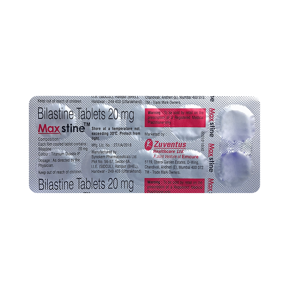 Maxstine Tablet belongs to a group of medicines known as antihistamines. It is used in the treatment of allergy symptoms such as runny nose, stuffy nose, sneezing, watery eyes, and congestion or stuffiness. Maxstine Tablet can be taken one hour before or two hours after food, but take it at the same time to get the most benefit. It should be taken as your doctor's advice. The dose and how often you take it depend on what you are taking it for. Your doctor will decide how much you need to improve your symptoms. Remember, dosage is decided on the basis of the type of medicine (tablet or syrup ), age, and present medical condition of the person. You should take this medicine for as long as it is prescribed for you. If you do not observe any improvement in the symptoms, consult with the doctor.The most common side effects of this medicine include headaches and drowsiness. If these bother you or appear serious, let your doctor know. There may be ways of reducing or preventing them. Generally, it is advised to drink plenty of fluids while on treatment with this medicine. To overcome dizziness, avoid driving or attention-seeking activities until you know how the medicine affects you.Before taking this medicine, let your doctor know if you are pregnant or breastfeeding. Your doctor should also know about all other medicines you are taking as many of these may make this medicine less effective or change the way it works. You must avoid fruit juice before taking the medicine.