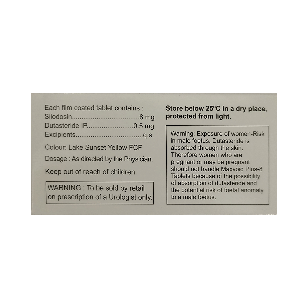 Maxvoid Plus 8 Tablet is a combination of two medicines: Silodosin and Dutasteride, which relieves the symptoms of benign prostatic hyperplasia. Silodosin is an alpha-blocker. It works by relaxing the muscle around the bladder exit and prostate gland so as to allow easy passage of urine. Dutasteride is a 5-alpha-reductase inhibitor which helps in shrinking the prostate gland by decreasing the level of the hormone which helps the prostate gland grow.
