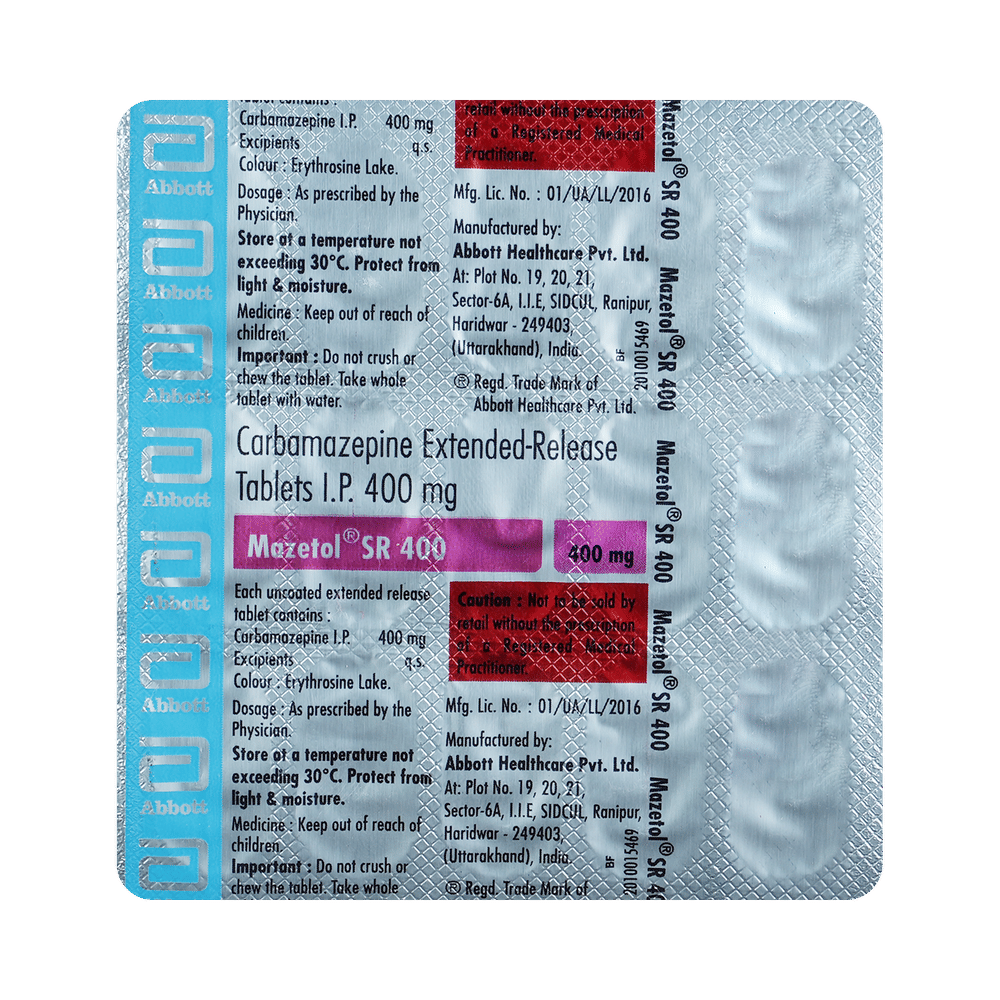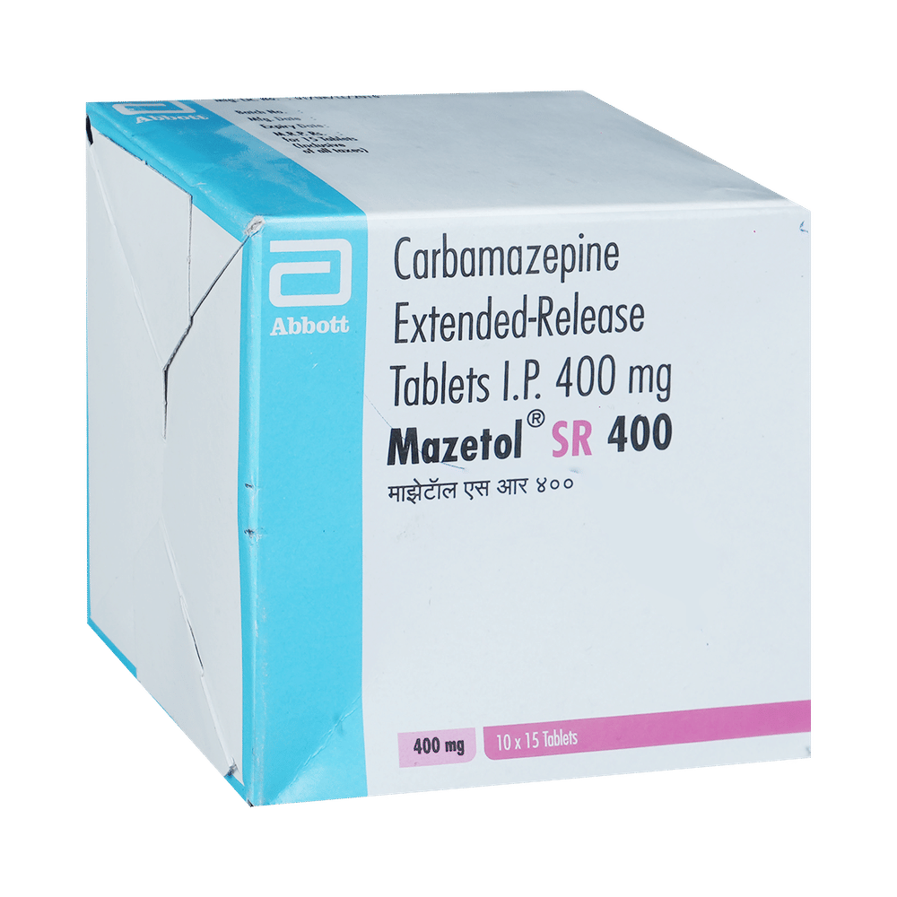 MazETOL SR 400 Tablet is an anti-epileptic medicine used to treat epilepsy. It helps prevent certain types of seizures (fits). It is also prescribed for a painful condition of the face, head, and neck known as trigeminal neuralgia and diabetes-related nerve pain (diabetic neuropathy). MazETOL SR 400 Tablet must be taken with or without food, but take it at the same time every day. The dose and how often you need to take it will be decided by your doctor so that you get the right amount to control your symptoms. It may be increased gradually. Many other medicines can interfere with this medicine so tell your doctor about all the medicines you are taking to make sure it is safe.You can take this medicine with or without food but take it regularly at the same time each day to get the maximum benefit. It is important to take this medicine for as long as you are advised, even if you feel well. Missing even a single dose may trigger a seizure and, if you stop taking it abruptly, your condition may get worse.The most common side effects of this medicine include nausea, vomiting, feeling dizzy, tired or drowsy, unsteadiness (balance disorder), constipation, dry mouth, and itching. Some people may develop blurring of vision and slurred speech. Most of the side effects are not serious. However, let your doctor know straight away if you notice a skin rash or if your mood becomes depressed or if you develop any thoughts about harming yourself. Before taking MazETOL SR 400 Tablet, tell your doctor if you have any heart problems, kidney or liver disease, difficulty in urinating, or any mental illness like depression. These conditions may affect your treatment. You may be advised some blood tests (eg. CBC) before starting treatment and then periodically thereafter, to monitor your progress.