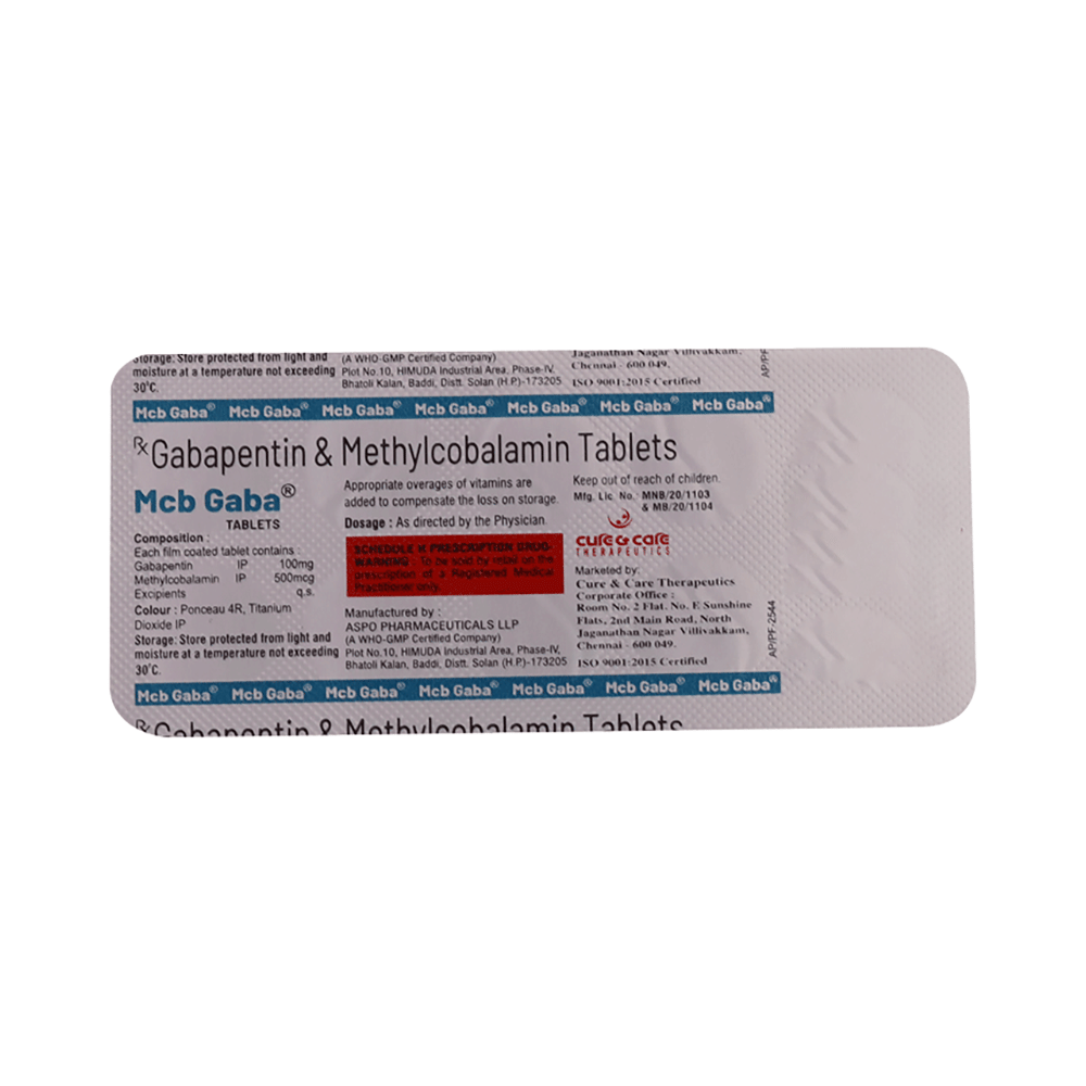 Mcb Gaba Tablet is a combination of two medicines: Gabapentin and Methylcobalamin. Gabapentin is an alpha 2 delta ligand which decreases pain by modulating calcium channel activity of the nerve cells. Methylcobalamin is a form of vitamin B which helps in the production of myelin, a substance that protects nerve fibers and rejuvenates damaged nerve cells. Together, they relieve neuropathic pain (pain from damaged nerves).