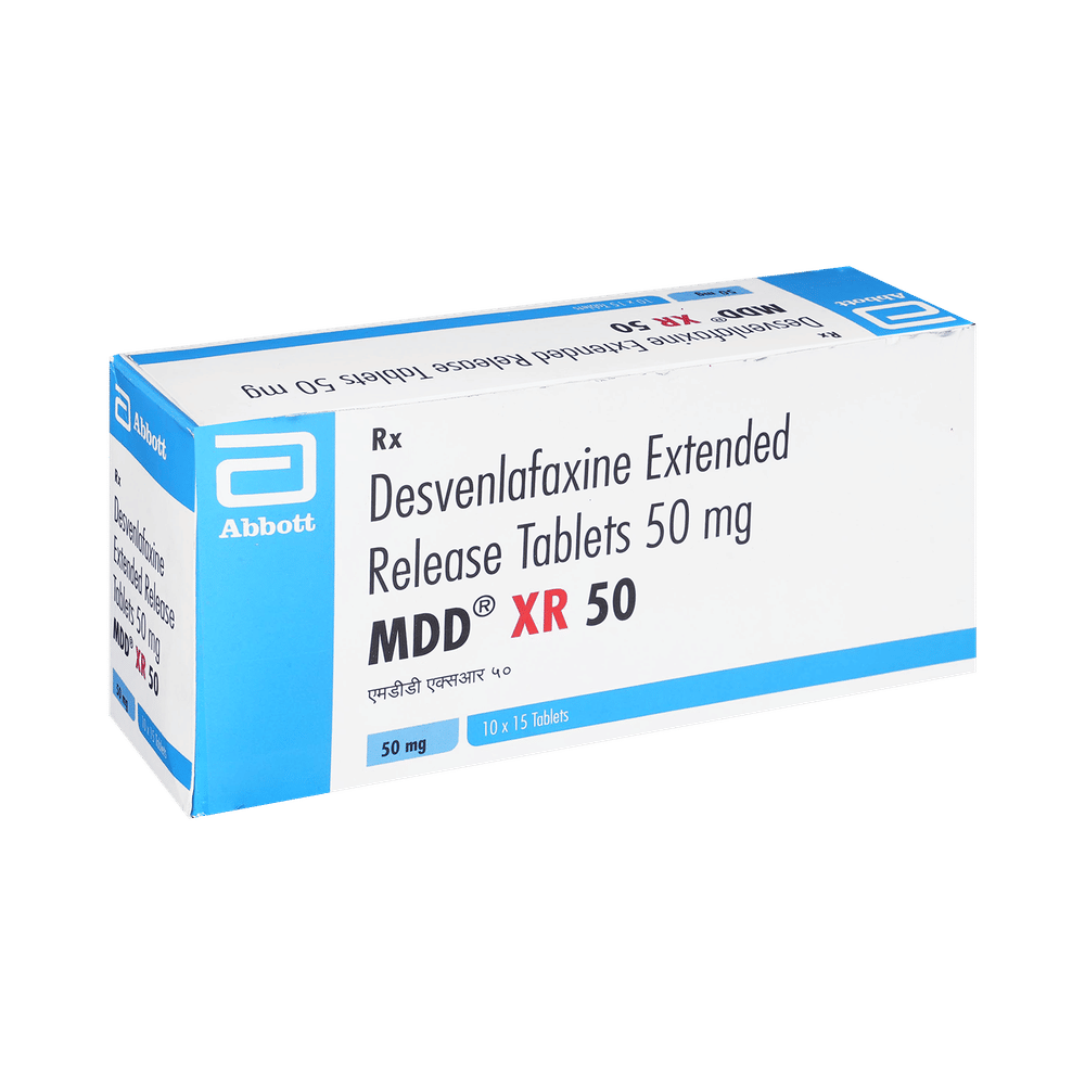 MDD XR 50 Tablet is a prescription medicine used in the treatment of depression. This medicine helps by increasing the level of chemical messengers (serotonin and noradrenaline) in the brain that have a calming effect on the brain and relaxes the nerves, thus treating your depression. MDD XR 50 Tablet is taken by mouth with or without food. Take it at a fixed time each day to maintain consistent level of medicine in the blood. In case you have missed a dose, take it as soon as you remember. Do not skip any doses and finish the full course of treatment even if you feel better. It is important that this medication is not stopped suddenly without talking to doctor as this may worsen your symptoms. Some common side effects of this medicine includes nausea, vomiting, insomnia (difficulty in sleeping), and constipation. It may cause an increase in blood pressure, especially during the first month of treatment, monitor your blood pressure regularly. It may even cause dizziness and sleepiness, do not drive or do anything that requires mental focus until you know how this medicine affects you. It is important to inform your doctor if you develop any unusual changes in mood as it may lead to suicidal thoughts.