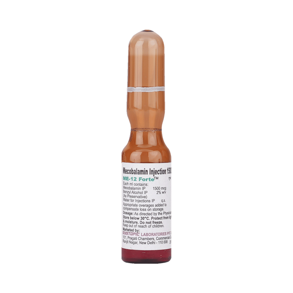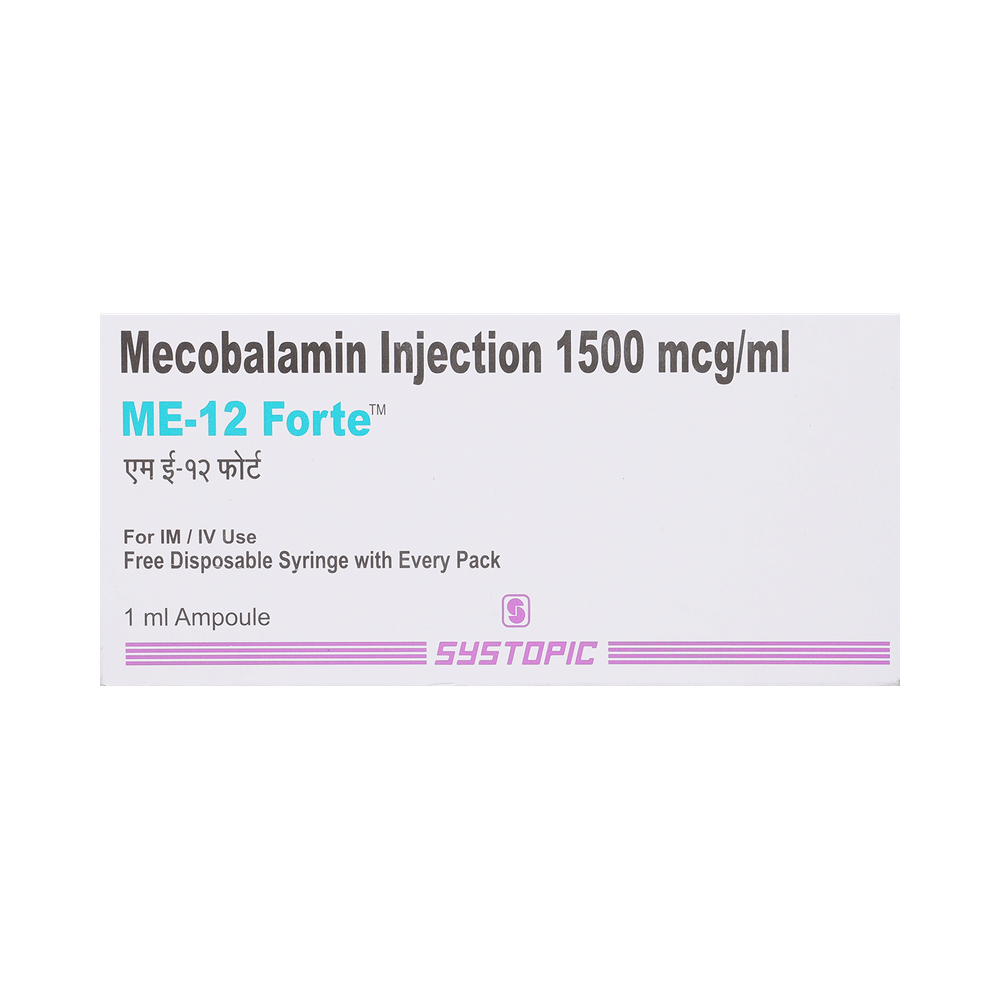 In Vitamin B12 deficiencyME 12 Forte Injection is a supplement of vitamin B12. It is used to treat low levels of vitamin B12 in your body. Vitamin B12 is essential in the formation of red blood cells and helps in the absorption of iron in the body. It also helps your body use fat and carbohydrates for energy and make new protein. In combination with other vitamins, it helps in strengthening the immune system, improves the metabolism of the body, and is important for the nervous system.