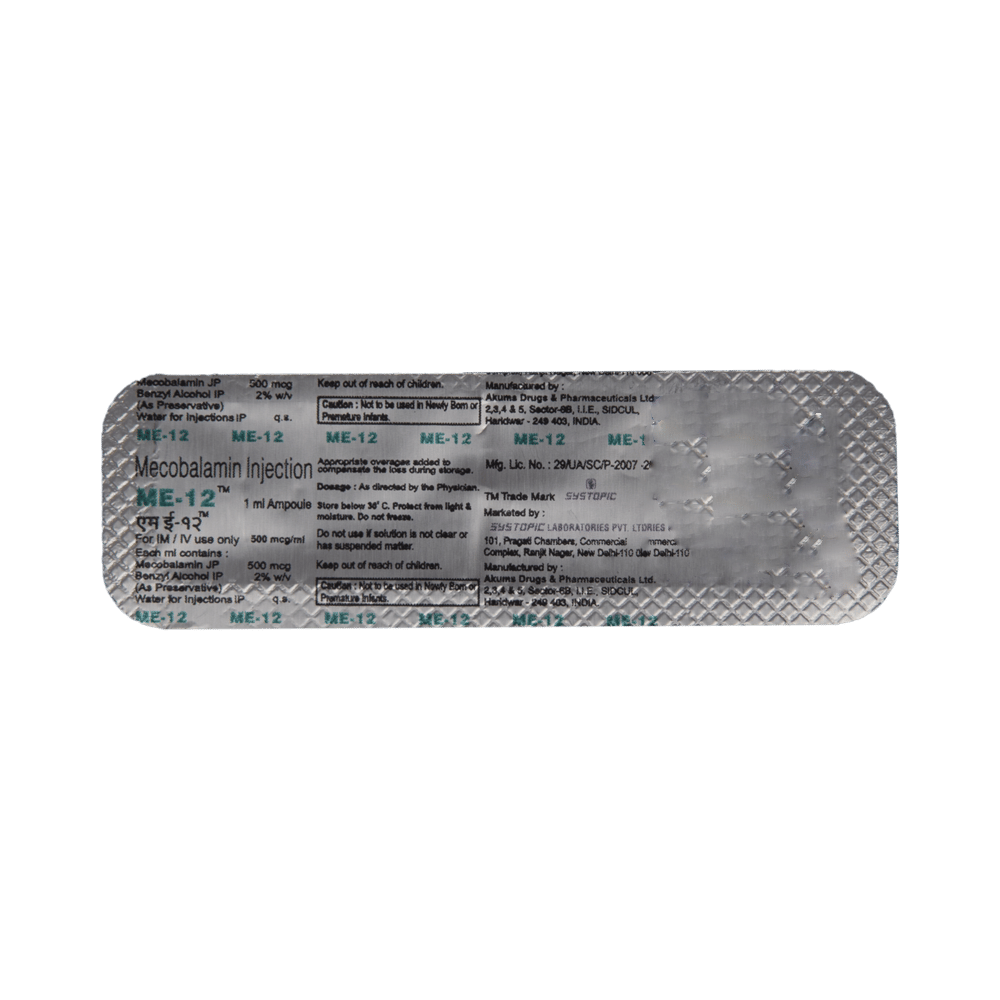ME 12 Injection is a man-made form of vitamin B12. It is used to treat deficiency of vitamin B12 in the body. Vitamin B12 is important for growth, cell reproduction, blood formation, and protein and tissue synthesis. It also helps to treat anemia, fatigue, and numbness or tingling in the hands and feet. ME 12 Injection should be used exactly as prescribed by the doctor. Follow all directions on the prescription label and read all medication guides before use. You should use it regularly and at a fixed time each day to get the most benefit from it. This medicine may be only part of a complete program of treatment that also includes making changes to your diet and taking other medicines and supplements. Learn about the foods you should eat to make sure you get enough vitamin B12 in your diet.ME 12 Injection is generally safe and does not usually cause any common side effects. Some medicines can decrease the absorption of vitamin B12, let your doctor know all other medicines you are taking to make sure you are safe. To make sure it is safe for you, before using the medicine let your doctor also know if you have any medical conditions such as Leber's disease, liver disease, or kidney disorder.