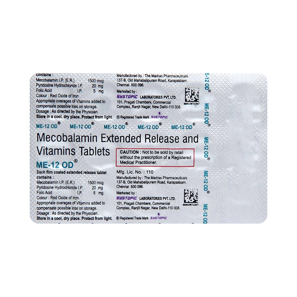 ME 12 OD Tablet ER is a prescription medicine that has a combination of nutritional supplements that is used in the treatment of nutritional deficiencies. It contains nutritional supplements that are important for the treatment and management of anemia and helps in the proper growth and development of the body. ME 12 OD Tablet ER may be taken with or without food. It should be used in the dose and duration as prescribed by your doctor. It is advised to take this medicine at a fixed time.This medicine should not be taken more than the recommended dose. It is usually a safe medicine with very minimal or no side effects. However, if you experience severe diarrhea, vomiting, or constipation, you should consult your doctor without delay.Before taking this medicine, tell your doctor if you have any other health conditions. Inform your doctor if you are taking any other medicines or if you are pregnant or breastfeeding. It is advised to avoid alcohol intake while taking this medicine.