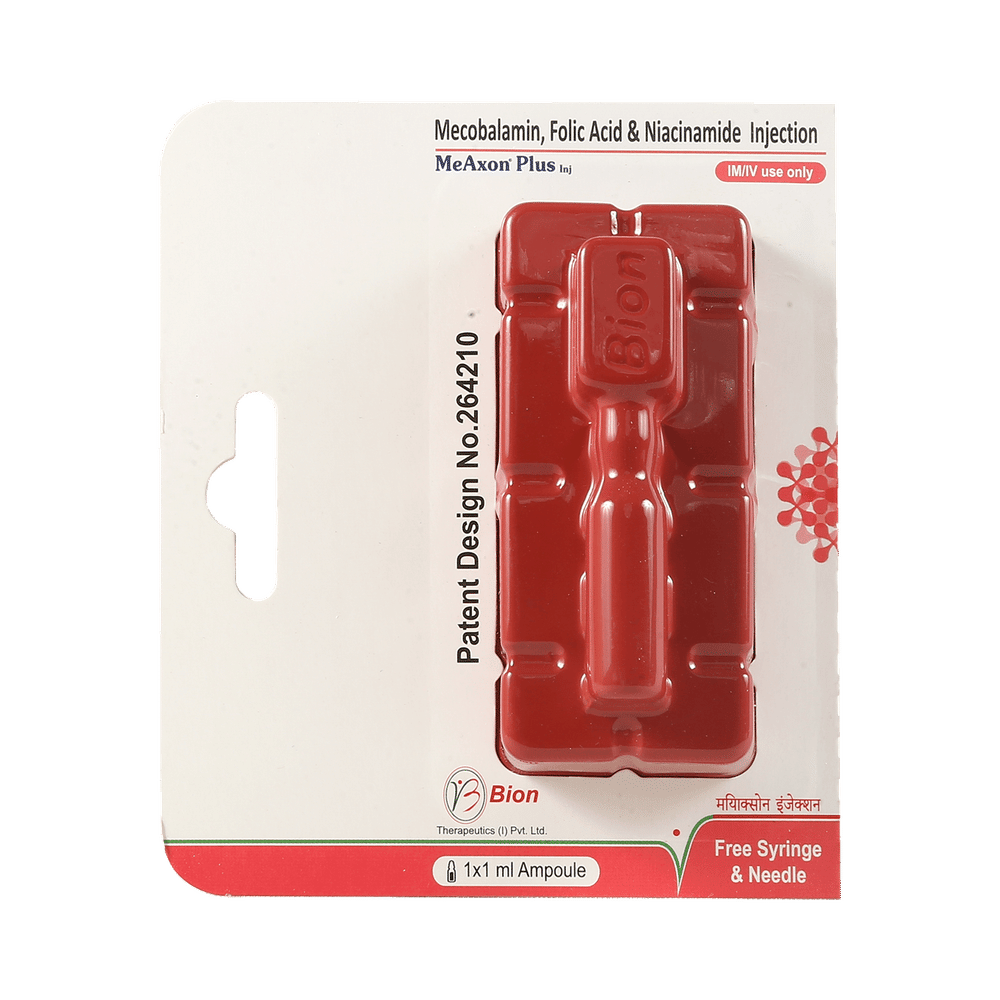 Meaxon Plus Injection is a combination of essential B-complex vitamins that support vital body functions. Folic acid helps in DNA synthesis and red blood cell formation. Methylcobalamin (vitamin B12) plays an important role in nerve function and red blood cell production, helping prevent B12 deficiency-related anemia. Niacinamide (vitamin B3) contributes to energy metabolism and overall cellular function. Together, these vitamins help maintain nerve health, aid in red blood cell formation, and support overall well-being.
