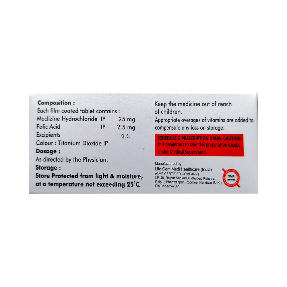 Salt Composition: Meclizine (25mg) + Folic Acid (2.5mg)