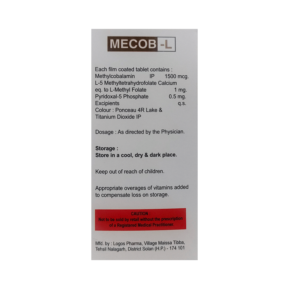 Mecob-L Tablet is a combination medicine that is used in the treatment of nutritional deficiencies. It helps in the growth and development of the body and replenishes the body's stores of important nutrients. Mecob-L Tablet may be taken with or without food. Take it in the exact dose and duration as prescribed by your doctor. Take the medicine at a fixed time to help you remember to take it. Do not take more than the recommended dose.Mecob-L Tablet is generally well tolerated and does not usually cause side effects. However, if you experience any symptoms while on treatment with Mecob-L Tablet, let your doctor know. If you experience any symptoms of severe allergic reactions like swelling, itching, difficulty breathing, and hives, contact your doctor immediately.Before taking Mecob-L Tablet, let your doctor know if you have any preexisting medical conditions. Do not take medicine if you have a known history of allergic reactions to any components in Mecob-L Tablet. This medicine is generally safe for pregnant and breastfeeding women.