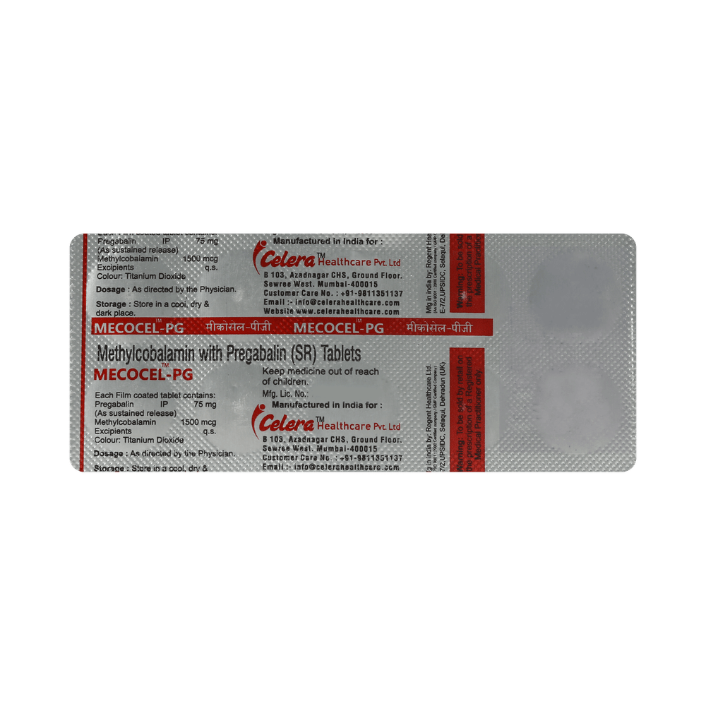 Mecocel PG 1500mcg/75mg Tablet is a combination of two medicines: Methylcobalamin and Pregabalin. Methylcobalamin is a form of vitamin B, which helps in the production of myelin, a substance that protects nerve fibers and rejuvenates damaged nerve cells. Pregabalin is an alpha-2 delta ligand that decreases pain by modulating the calcium channel activity of the nerve cells. Together, they relieve neuropathic pain (pain from damaged nerves).