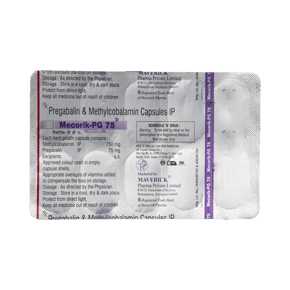 Mecorik-PG 75 Capsule is a combination of two medicines: Methylcobalamin and Pregabalin. Methylcobalamin is a form of vitamin B, which helps in the production of myelin, a substance that protects nerve fibers and rejuvenates damaged nerve cells. Pregabalin is an alpha-2 delta ligand that decreases pain by modulating the calcium channel activity of the nerve cells. Together, they relieve neuropathic pain (pain from damaged nerves).
