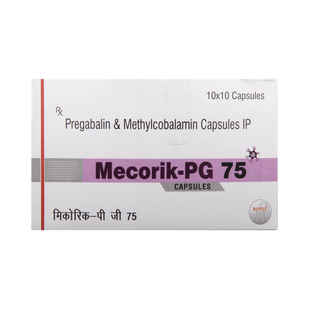 Mecorik-PG 75 Capsule is a prescription medicine used for the treatment of neuropathic pain. It decreases pain by modulating the calcium channel activity of the nerve cells. This medicine also protects nerve fibers and heals damaged nerve cells. Mecorik-PG 75 Capsule may be taken with or without food, preferably at bedtime. It is advised to take it at the same time each day as this helps to maintain a consistent level of medicine in the body. Take this medicine in the dose and duration advised by your doctor. If you miss a dose of this medicine, take it as soon as you remember. Finish the full course of treatment even if you feel better. This medication must not be stopped suddenly without talking to the doctor.Some common side effects of this medicine include nausea, vomiting, diarrhea, constipation, blurred vision, dizziness, and sleepiness. Do not drive or do anything that requires mental focus until you know how this medicine affects you. The side effects are mild and usually improve with time. It may also cause weight gain in some people. Exercise regularly and have a balanced diet to keep your weight in check. Inform your doctor if you develop any unusual changes in mood or behavior, new or worsening depression, or suicidal thoughts.Your doctor should also know about all other medicines you are taking, as many of these may make this medicine less effective or change the way it works. Inform your doctor if you are pregnant, planning pregnancy, or breastfeeding to make sure it is safe for you and the developing baby.