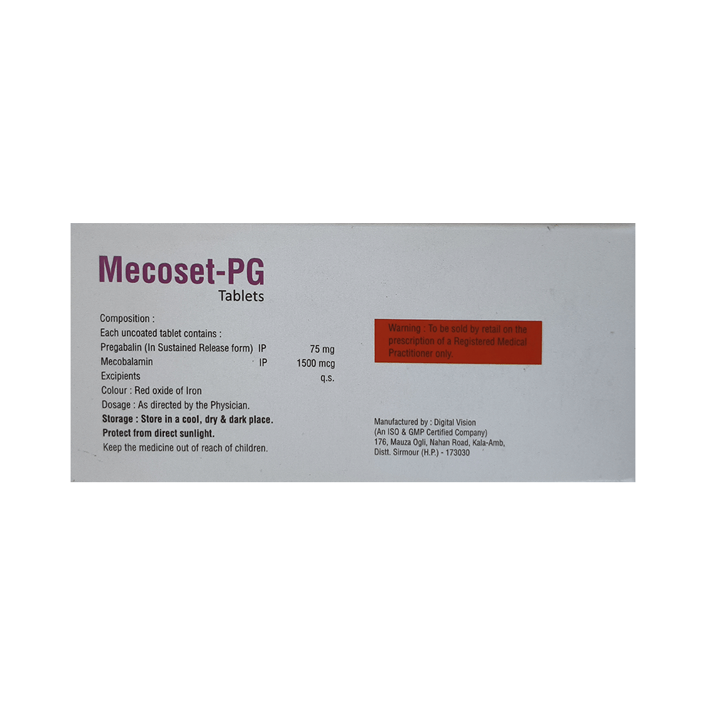 Mecoset-PG Tablet SR is a combination of two medicines: Methylcobalamin and Pregabalin. Methylcobalamin is a form of vitamin B, which helps in the production of myelin, a substance that protects nerve fibers and rejuvenates damaged nerve cells. Pregabalin is an alpha-2 delta ligand that decreases pain by modulating the calcium channel activity of the nerve cells. Together, they relieve neuropathic pain (pain from damaged nerves).