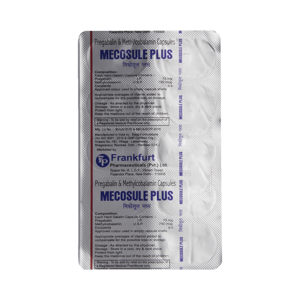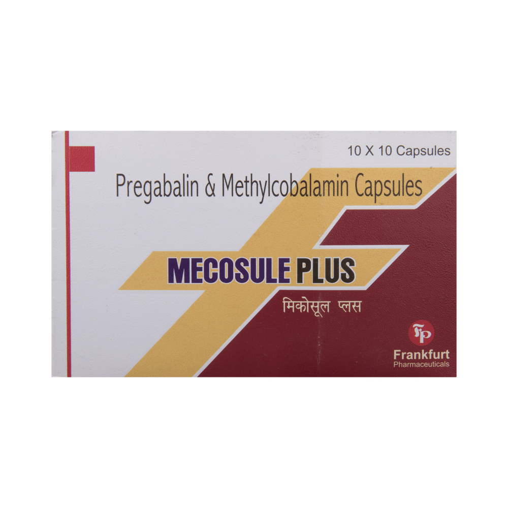 Mecosule Plus Capsule is a prescription medicine used for the treatment of neuropathic pain. It decreases pain by modulating the calcium channel activity of the nerve cells. This medicine also protects nerve fibers and heals damaged nerve cells. Mecosule Plus Capsule may be taken with or without food, preferably at bedtime. It is advised to take it at the same time each day as this helps to maintain a consistent level of medicine in the body. Take this medicine in the dose and duration advised by your doctor. If you miss a dose of this medicine, take it as soon as you remember. Finish the full course of treatment even if you feel better. This medication must not be stopped suddenly without talking to the doctor.Some common side effects of this medicine include nausea, vomiting, diarrhea, constipation, blurred vision, dizziness, and sleepiness. Do not drive or do anything that requires mental focus until you know how this medicine affects you. The side effects are mild and usually improve with time. It may also cause weight gain in some people. Exercise regularly and have a balanced diet to keep your weight in check. Inform your doctor if you develop any unusual changes in mood or behavior, new or worsening depression, or suicidal thoughts.Your doctor should also know about all other medicines you are taking, as many of these may make this medicine less effective or change the way it works. Inform your doctor if you are pregnant, planning pregnancy, or breastfeeding to make sure it is safe for you and the developing baby.