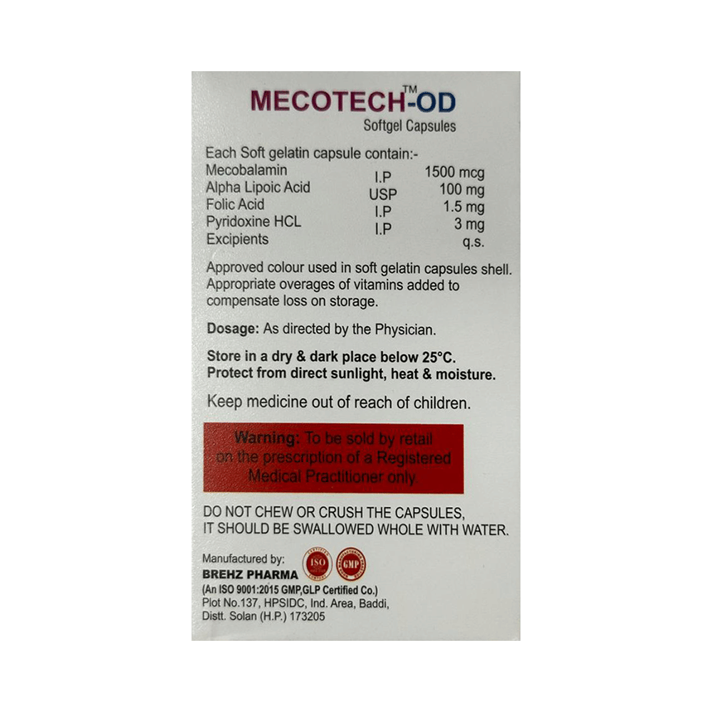 Mecotech-OD Softgel Capsule is a combination of four nutritional supplements:Methylcobalamin, Alpha Lipoic Acid, Vitamin B6 (Pyridoxine) and Folic Acid which replenish the body's stores of important nutrients.