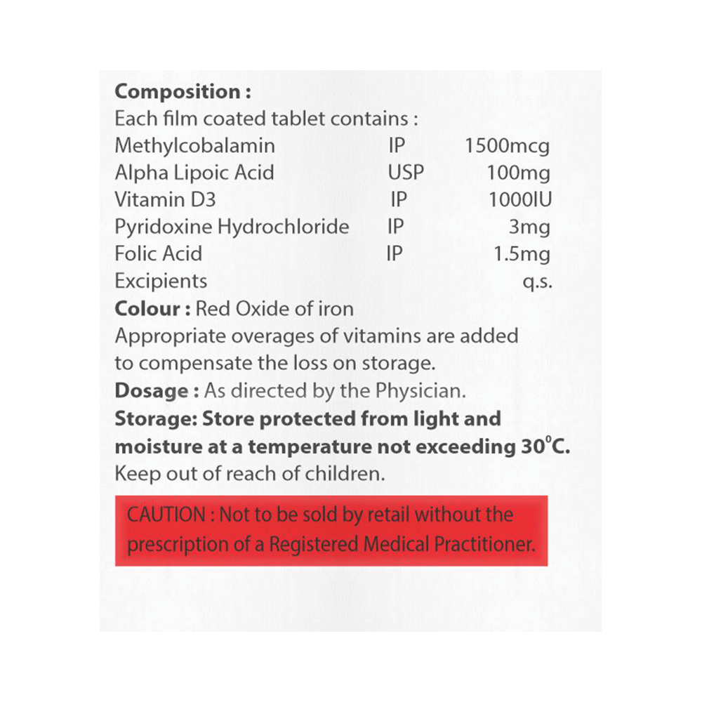 Salt Composition: Methylcobalamin (1500mcg) + Alpha Lipoic Acid (100mg) + Vitamin B6 (Pyridoxine) (3mg) + Folic Acid (1.5mg) + Vitamin D3 (1000IU)