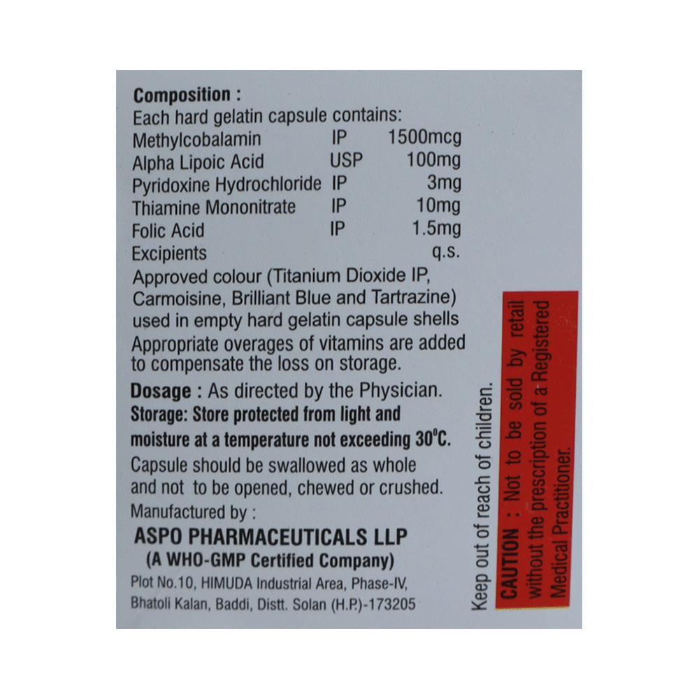 Salt Composition: Methylcobalamin (1500mcg) + Alpha Lipoic Acid (100mg) + Thiamine mononitrate (10mg) + Pyridoxine Hydrochloride (3mg) + Folic Acid (1.5mg)