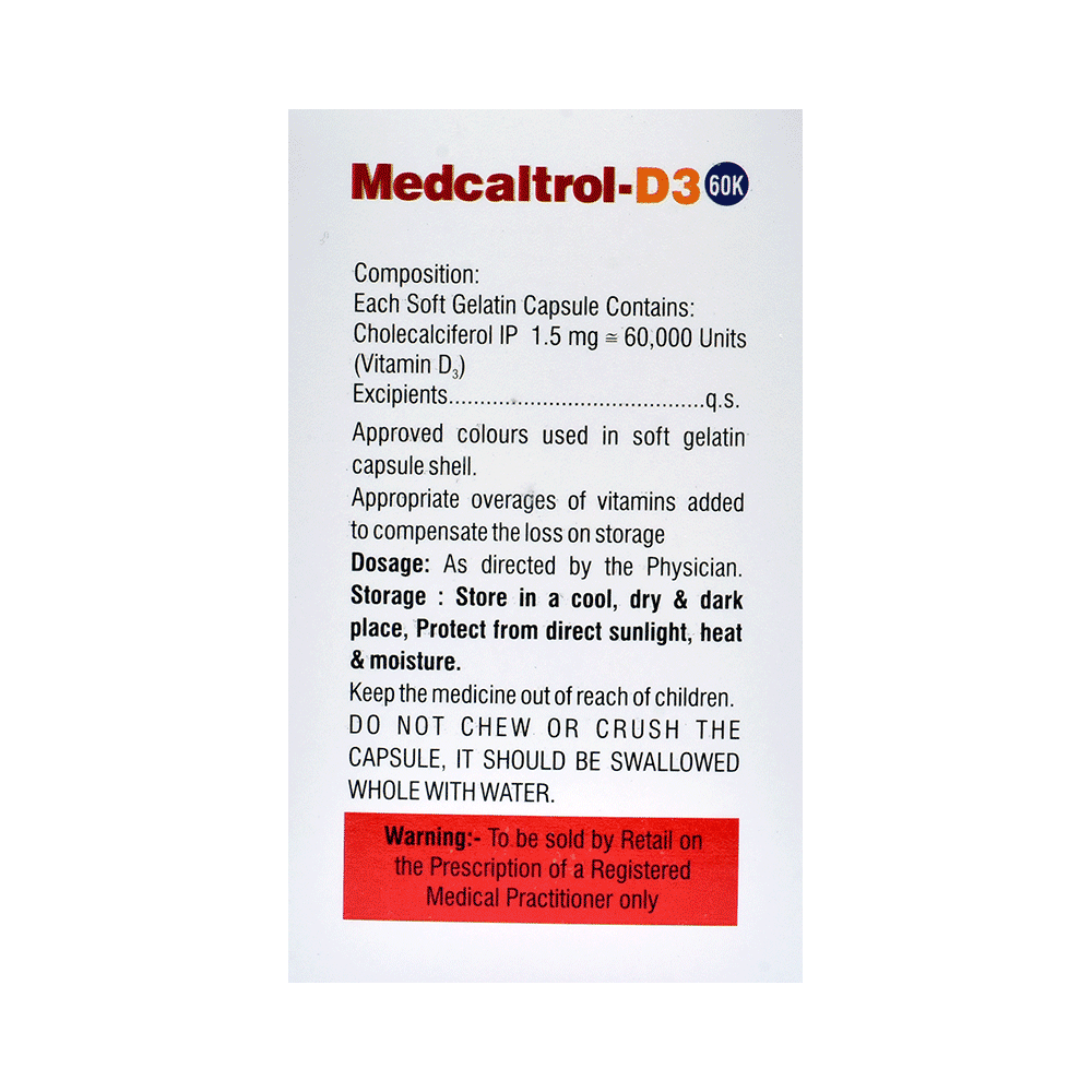 Medcaltrol-D3 60K Softgel Capsule is used in the treatment of vitamin D deficiency and osteoporosis. It helps the body to absorb calcium. Calcium is essential for maintaining strong and healthy bones. It is used when your diet does not provide enough calcium. Medcaltrol-D3 60K Softgel Capsule should be taken as directed by your doctor. It is best taken with or after food, as this helps your body absorb it, and you should take it regularly to get the most benefits. If you are using it to treat osteoporosis, you will also be prescribed other medicines. This medicine may be only part of a complete treatment program that includes making changes to your diet and taking calcium and vitamin supplements. Learn about the foods you should eat to ensure you get enough calcium and vitamin D.Medcaltrol-D3 60K Softgel Capsule has few side effects, and none are common. If you take too much, you may feel weakness, muscle pain, or a metallic taste in your mouth. If you experience any such side effects, speak with your doctor. They may be able to help you reduce or treat the symptoms.Before taking this medicine, tell your doctor if you have high calcium levels in your blood or if you have any heart, kidney, or liver disease. Some other medicines can decrease the absorption of vitamin D3, so let your doctor know about all the other medicines you are taking to make sure you are safe. This medicine may help during pregnancy when your body needs more vitamin D, but too much could harm your baby. Discuss it with your doctor.