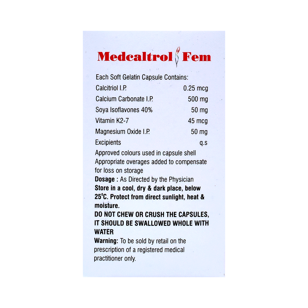 Medcaltrol Fem Softgel Capsule is a combination of vitamin and mineral supplements used to treat nutritional deficiencies in the body. It ensures the proper growth and functioning of the body, supports bone health, prevents calcium deficiency, and helps in conditions like osteoporosis, weak bones, and vitamin D deficiency. Medcaltrol Fem Softgel Capsule may be taken with or without food. It should be used in the dose and duration prescribed by your doctor. It is advised to take this medicine at a fixed time to avoid missing a dose.This medicine should not be taken more than the recommended dose. It is usually a safe medicine with very minimal or no side effects. However, if you experience severe diarrhea, vomiting, or constipation, you should consult your doctor without delay.Before taking this medicine, tell your doctor if you have any other health conditions. Inform your doctor if you are taking any other medicines or if you are pregnant or breastfeeding. It is advised not to consume alcohol after taking this medicine.
