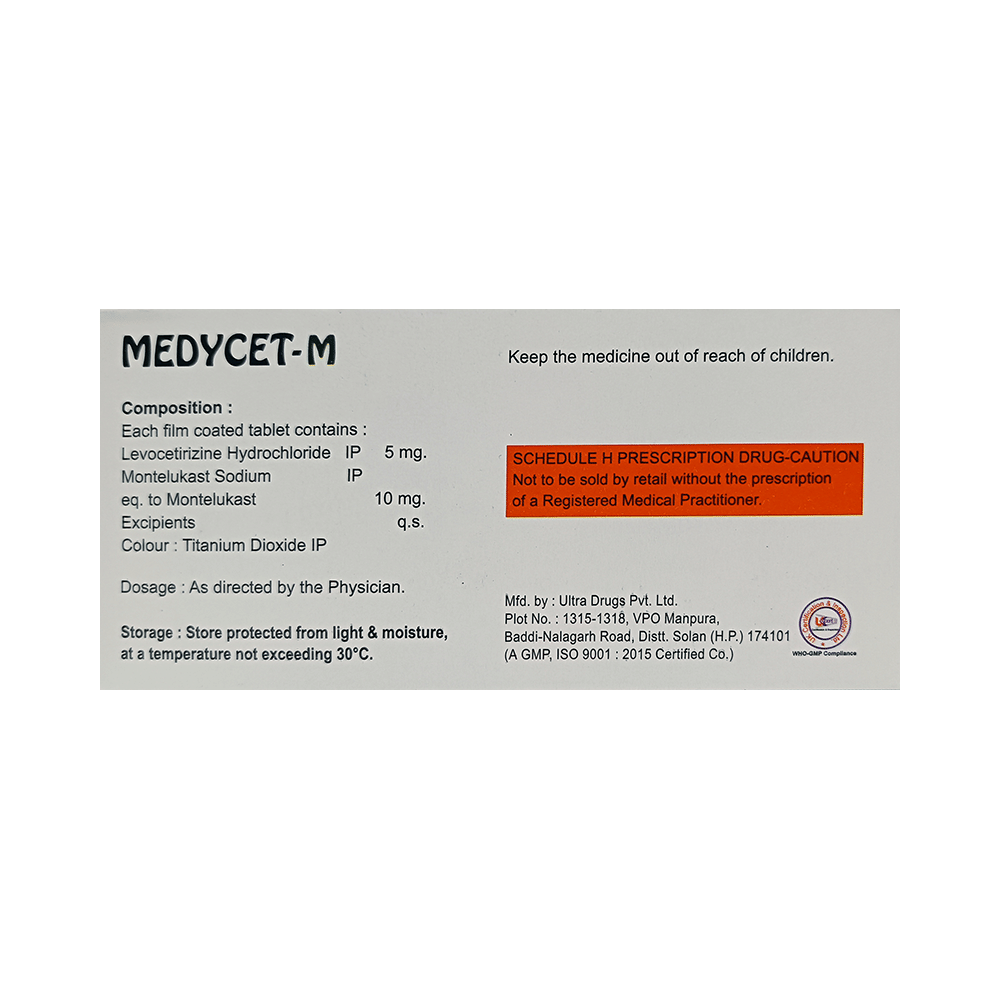 Medycet-M Tablet is a combination medicine used in the treatment of allergic symptoms such as runny nose, stuffy nose, sneezing, itching, swelling, watery eyes and congestion or stuffiness. It also reduces inflammation in the airways and make breathing easier. Medycet-M Tablet is taken with or without food in a dose and duration as advised by the doctor. The dose you are given will depend on your condition and how you respond to the medicine. You should keep taking this medicine for as long as your doctor recommends. If you stop treatment too early your symptoms may come back and your condition may worsen. Let your healthcare team know about all other medications you are taking as some may affect, or be affected by this medicine.The most common side effects are nausea, diarrhea, vomiting, dryness in the mouth, headache, skin rash, flu-like symptoms, and fatigue. Most of these are temporary and usually resolve with time. Contact your doctor straight away if you are at all concerned about any of these side effects. This medicine may cause dizziness and sleepiness, so do not drive or do anything that requires mental focus until you know how this medicine affects you. Avoid drinking alcohol while taking this medicine as it can worsen your sleepiness.Never support self-medication or recommend your medicine to another person. It is beneficial to have plenty of fluids while taking this medication. Before you start taking this medicine it is important to inform your doctor if you are suffering from kidney disease.