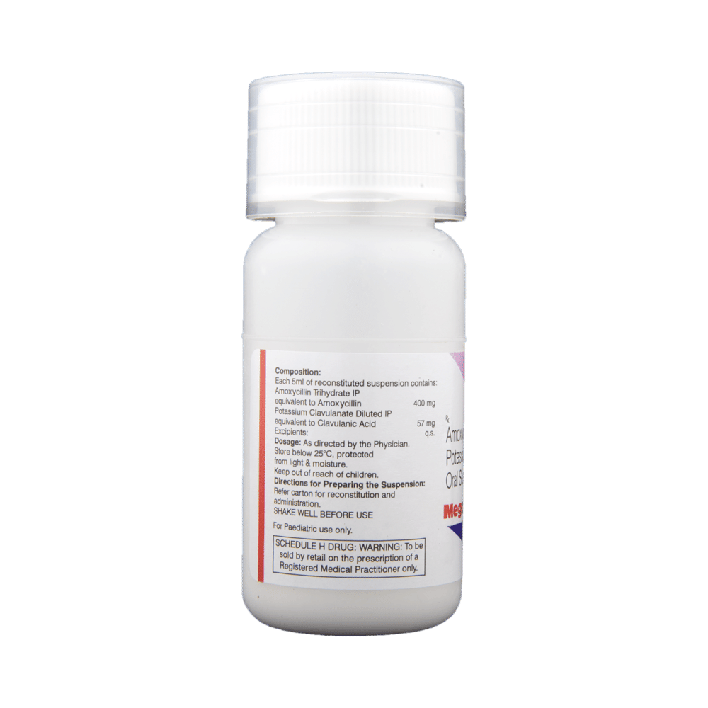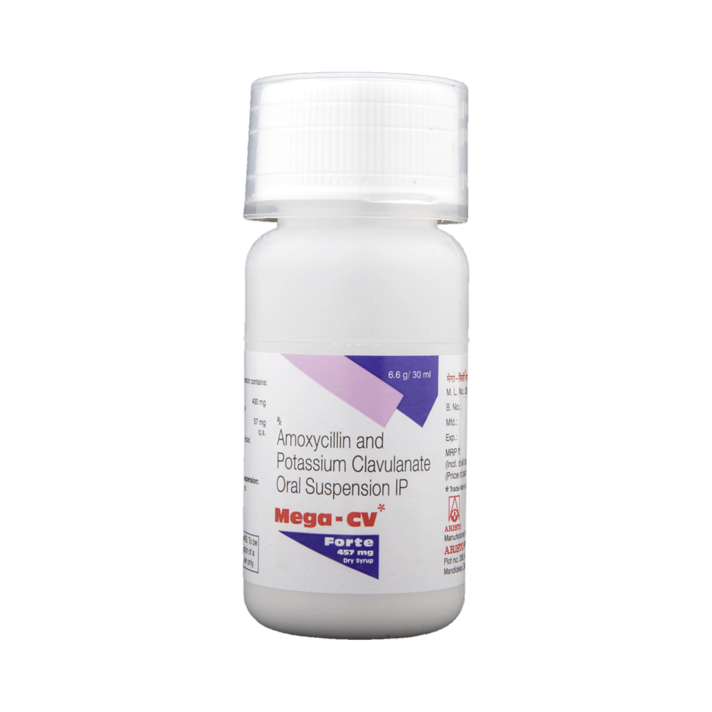 Mega-CV Forte 457mg Dry Syrup is an antibiotic medicine that helps treat bacterial infections of the ear, nose, throat, chest, lungs, teeth, skin, and urinary tract. It is capable of killing bacteria that have become resistant to other therapies and thus also helps treat tuberculosis that is resistant to other treatments. You can give Mega-CV Forte 457mg Dry Syrup to your child with or without food. It is better to give it with food as that helps increase absorption and decrease the risk of stomach upset. The doctor may prescribe giving it two to three times a day. Medicine dose depends on the severity of the infection, its type, and your child’s body weight and age. So, stick to the dose, time, and way prescribed. If your child vomits the medicine within 30 minutes of intake, let the child calm down and repeat the dose. Do not double dose if it's the time for the next dose.Mega-CV Forte 457mg Dry Syrup may cause vomiting, diarrhea, nausea, abdominal pain, and allergy. These side effects should diminish on their own. But, in case they persist or start bothering your child, you must not delay speaking to your child’s doctor.Share your child’s entire medical history with the doctor, including any previous episode of allergy, heart problem, blood disorder, birth defects, airway obstruction, lung anomaly, gastrointestinal problem, skin disorder, liver impairment, and kidney malfunction. This information will assist the doctor in making dose alterations and for planning your child’s overall treatment.