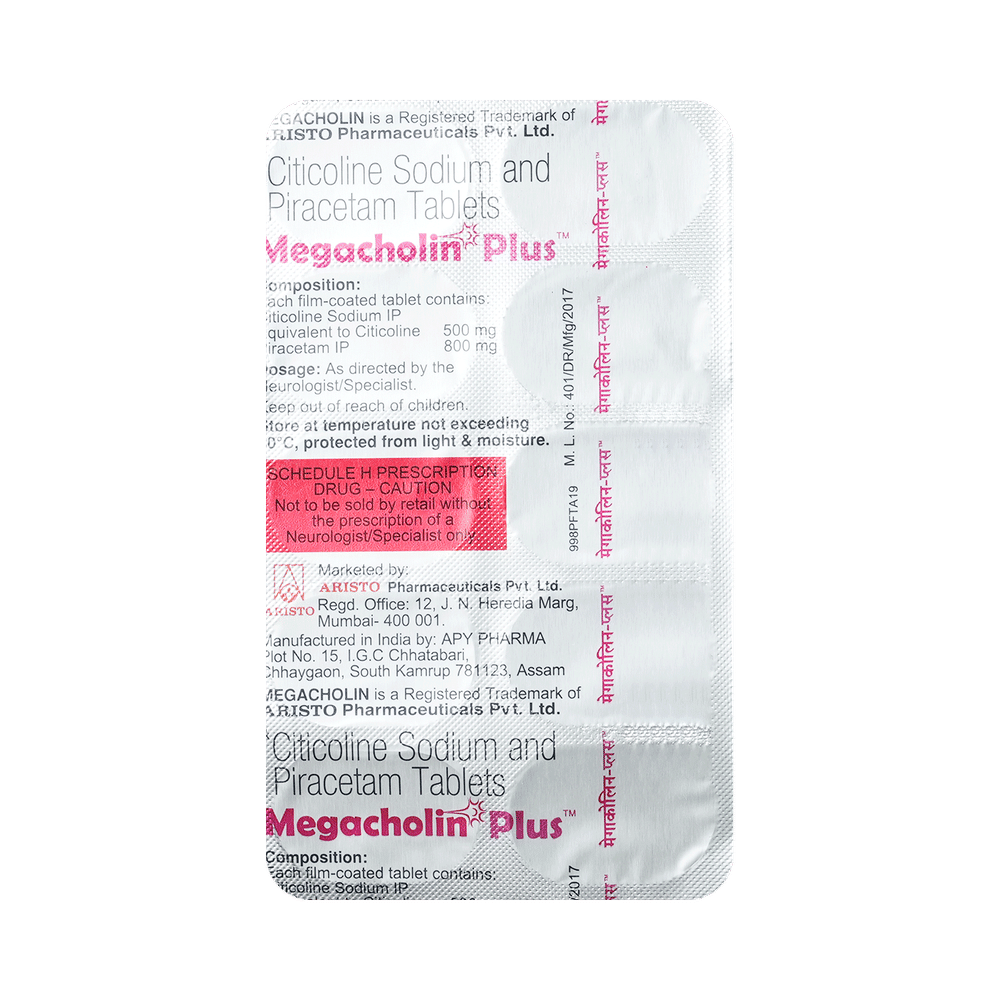 Megacholin Plus Tablet is a combination of two medicines: Citicoline and Piracetam. Citicoline is a nerve protecting medicine. It works on the brain by nourishing the nerve cells, protects them from damage and improves their survival. Piracetam is a GABA (gamma amino butyric acid) analogue. It works by protecting the brain and nervous system against shortness of oxygen and also affects various ion channels on nerve cell membrane.