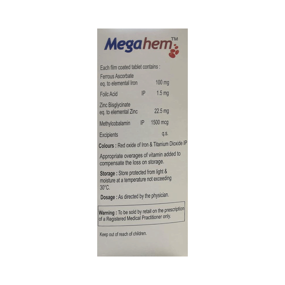 Megahem Tablet is a combination of vitamins and mineral supplements prescribed to treat vitamin, folate, and other nutritional deficiencies. It ensures the proper growth and functioning of the body and strengthens immunity. It also treats and prevent different forms of anemia. Megahem Tablet is taken orally with or without food. It should be used in the dose and duration prescribed by your doctor. It is advised to take this medicine at a fixed time to avoid missing a dose.This medicine should not be taken more than the recommended dose. It is usually a safe medicine with very minimal or no side effects. However, some people may experience symptoms like nausea and constipation. Consult your doctor if such symptoms do not resolve on their own or get worse.Before taking this medicine, tell your doctor if you have any other health conditions. Inform your doctor if you are taking any other medicines or if you are pregnant or breastfeeding. It is advised not to take alcohol after taking this medicine.