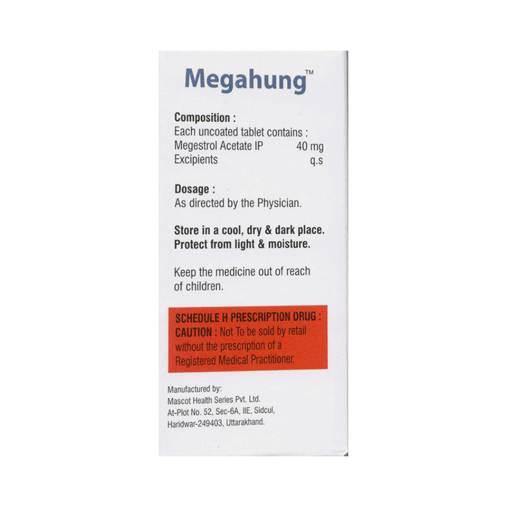 Megahung Tablet is used to treat breast cancer and endometrial cancer. It specifically helps treat breast and endometrial cancer that are hormone dependent. It may also be used for treating low appetite and weight loss in patients with advanced cancer or HIV. Megahung Tablet should be taken as your doctor advice. Your doctor will decide how much you need to take and for how much time. You may take it with or without food but better to take it at a fixed time. You should take this medicine for as long as it is prescribed for you.The most common side effects of this medicine include weight gain, increase in appetite, shortness of breath, hot flushes (warm face and neck), high blood pressure, and constipation. Most of these are temporary, and go away as soon as the body adjusts to the treatment. If any of these bothers you, let your doctor know. There may be ways of reducing or preventing them.Your doctor should also know about all other medicines you are taking as many of these may make this medicine less effective or change the way it works. Pregnant and breastfeeding women should not take this medicine. Your doctor might do regular blood tests to check your hormones and blood sugar levels while you are taking this medicine.