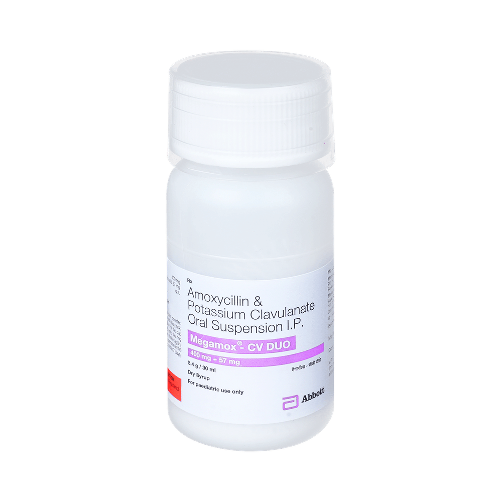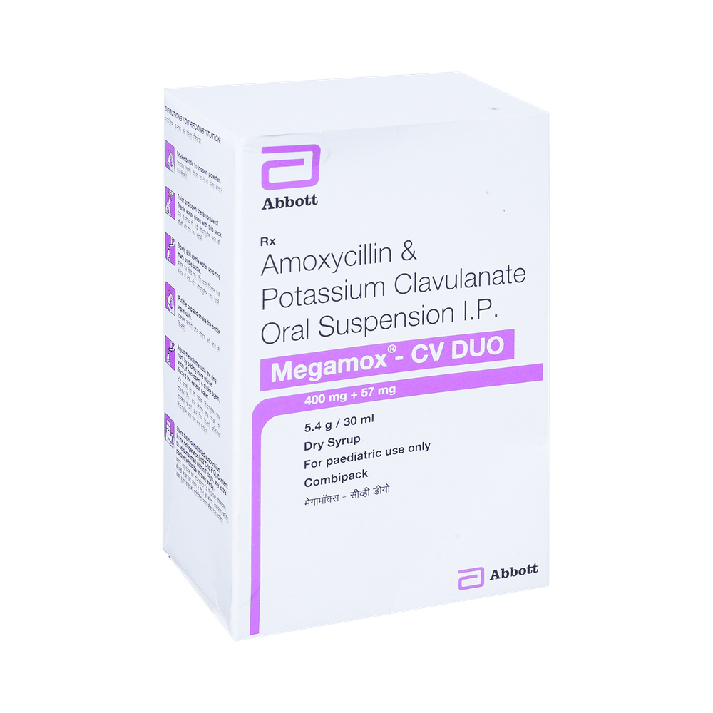 Megamox-CV Duo Dry Syrup is an antibiotic medicine that helps treat bacterial infections of the ear, nose, throat, chest, lungs, teeth, skin, and urinary tract. It is capable of killing bacteria that have become resistant to other therapies and thus also helps treat tuberculosis that is resistant to other treatments. You can give Megamox-CV Duo Dry Syrup to your child with or without food. It is better to give it with food as that helps increase absorption and decrease the risk of stomach upset. The doctor may prescribe giving it two to three times a day. Medicine dose depends on the severity of the infection, its type, and your child’s body weight and age. So, stick to the dose, time, and way prescribed. If your child vomits the medicine within 30 minutes of intake, let the child calm down and repeat the dose. Do not double dose if it's the time for the next dose.Megamox-CV Duo Dry Syrup may cause vomiting, diarrhea, nausea, abdominal pain, and allergy. These side effects should diminish on their own. But, in case they persist or start bothering your child, you must not delay speaking to your child’s doctor.Share your child’s entire medical history with the doctor, including any previous episode of allergy, heart problem, blood disorder, birth defects, airway obstruction, lung anomaly, gastrointestinal problem, skin disorder, liver impairment, and kidney malfunction. This information will assist the doctor in making dose alterations and for planning your child’s overall treatment.