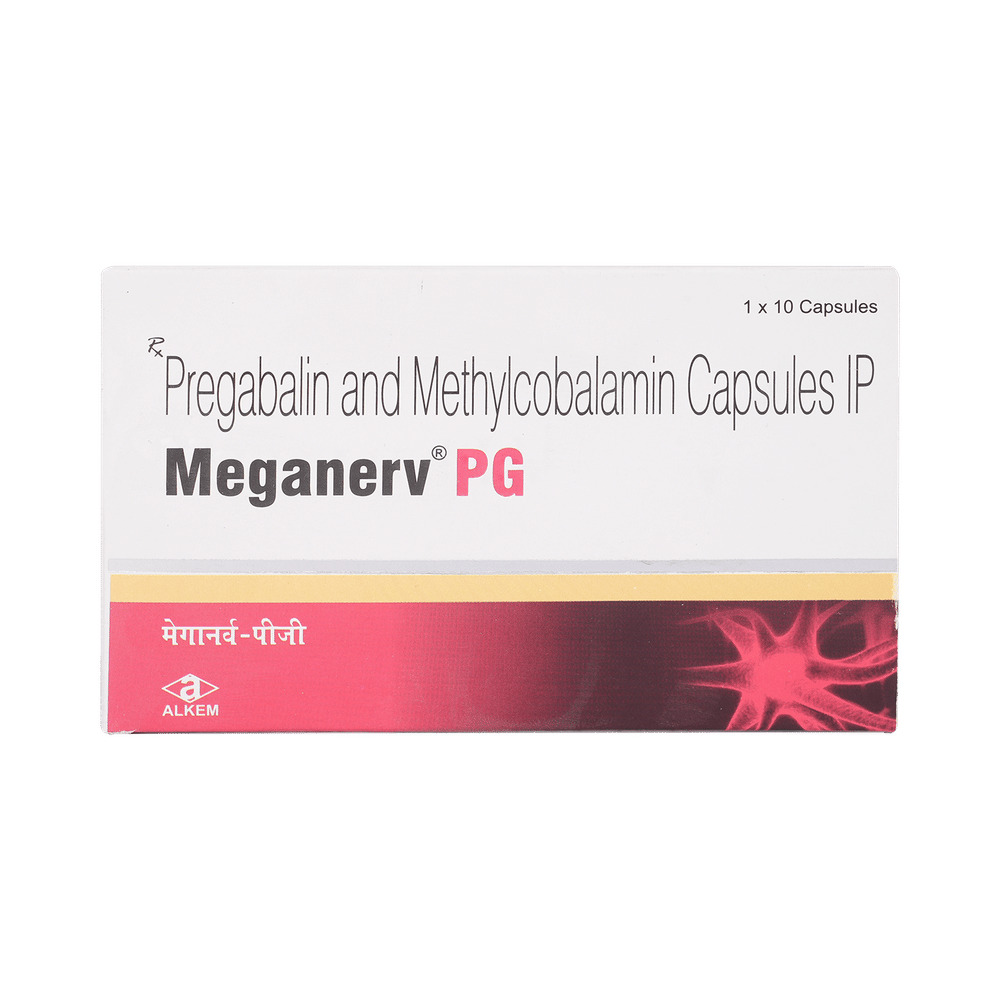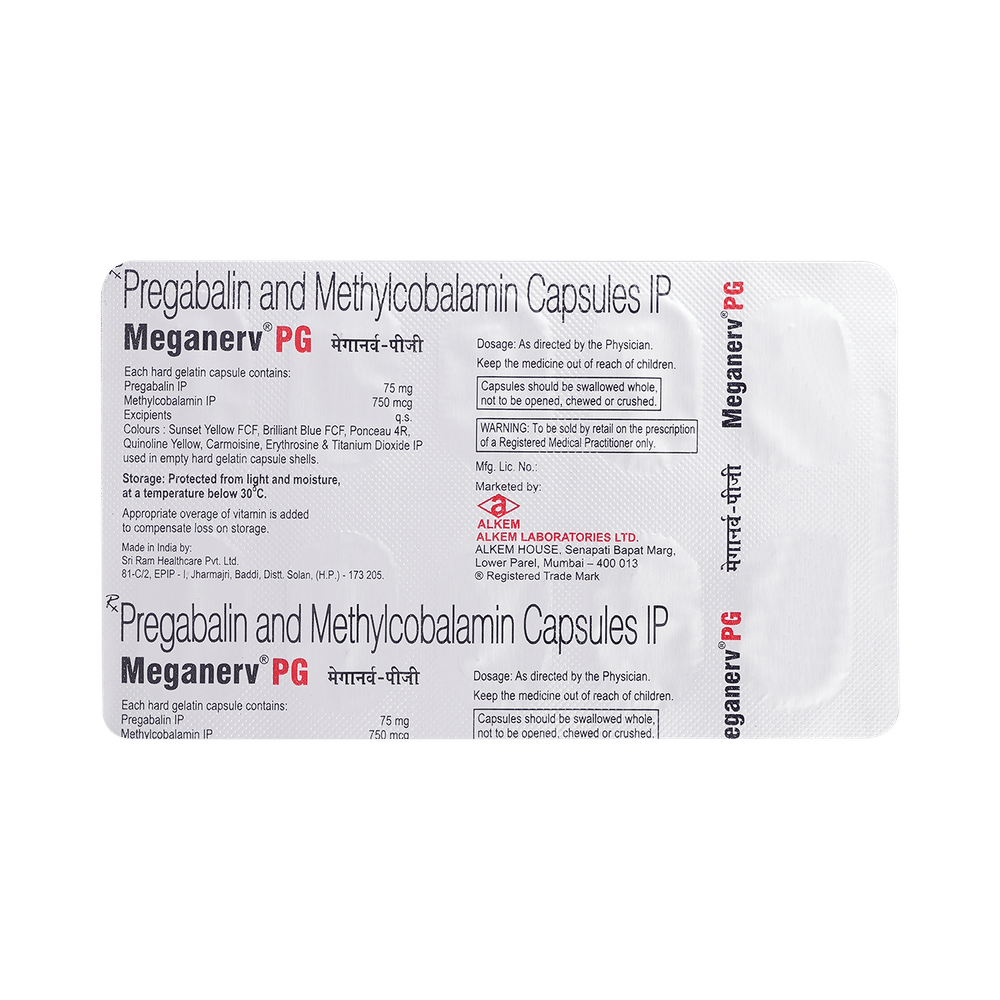 Meganerv PG 750mcg/75mg Capsule is a prescription medicine used for the treatment of neuropathic pain. It decreases pain by modulating the calcium channel activity of the nerve cells. This medicine also protects nerve fibers and heals damaged nerve cells. Meganerv PG 750mcg/75mg Capsule may be taken with or without food, preferably at bedtime. It is advised to take it at the same time each day as this helps to maintain a consistent level of medicine in the body. Take this medicine in the dose and duration advised by your doctor. If you miss a dose of this medicine, take it as soon as you remember. Finish the full course of treatment even if you feel better. This medication must not be stopped suddenly without talking to the doctor.Some common side effects of this medicine include nausea, vomiting, diarrhea, constipation, blurred vision, dizziness, and sleepiness. Do not drive or do anything that requires mental focus until you know how this medicine affects you. The side effects are mild and usually improve with time. It may also cause weight gain in some people. Exercise regularly and have a balanced diet to keep your weight in check. Inform your doctor if you develop any unusual changes in mood or behavior, new or worsening depression, or suicidal thoughts.Your doctor should also know about all other medicines you are taking, as many of these may make this medicine less effective or change the way it works. Inform your doctor if you are pregnant, planning pregnancy, or breastfeeding to make sure it is safe for you and the developing baby.