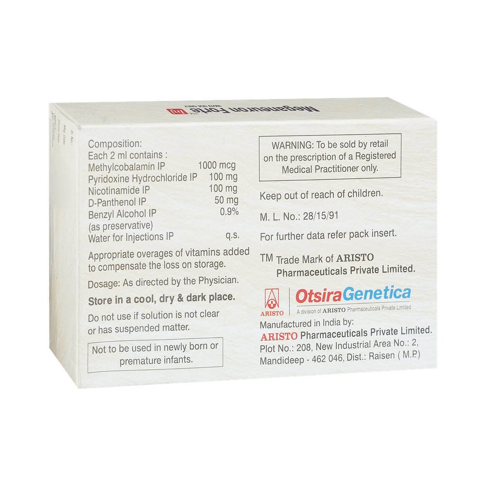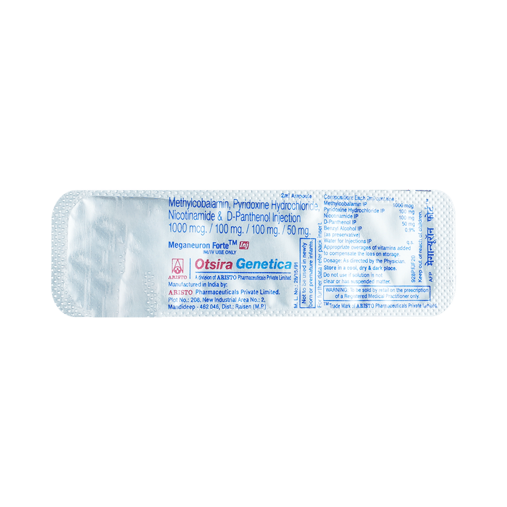 Meganeuron Forte Injection is a combination of four nutritional supplements from vitamin family. Methylcobalamin is a form of vitamin B12 that restores its level in the body thereby helping in treating certain anemias and nerve problems. Vitamin B6 (Pyridoxine) or vitamin B6 provides essential nutrients to regulate different functions of the body. Niacinamide is a form of vitamin B3 that helps to provide energy and improves the health of your skin. D-Panthenol is also known as vitamin b5 that helps in proper utilization of other nutrients such as carbohydrate, fat, and protein. Thus, Meganeuron Forte Injection helps to provide proper nutrition.