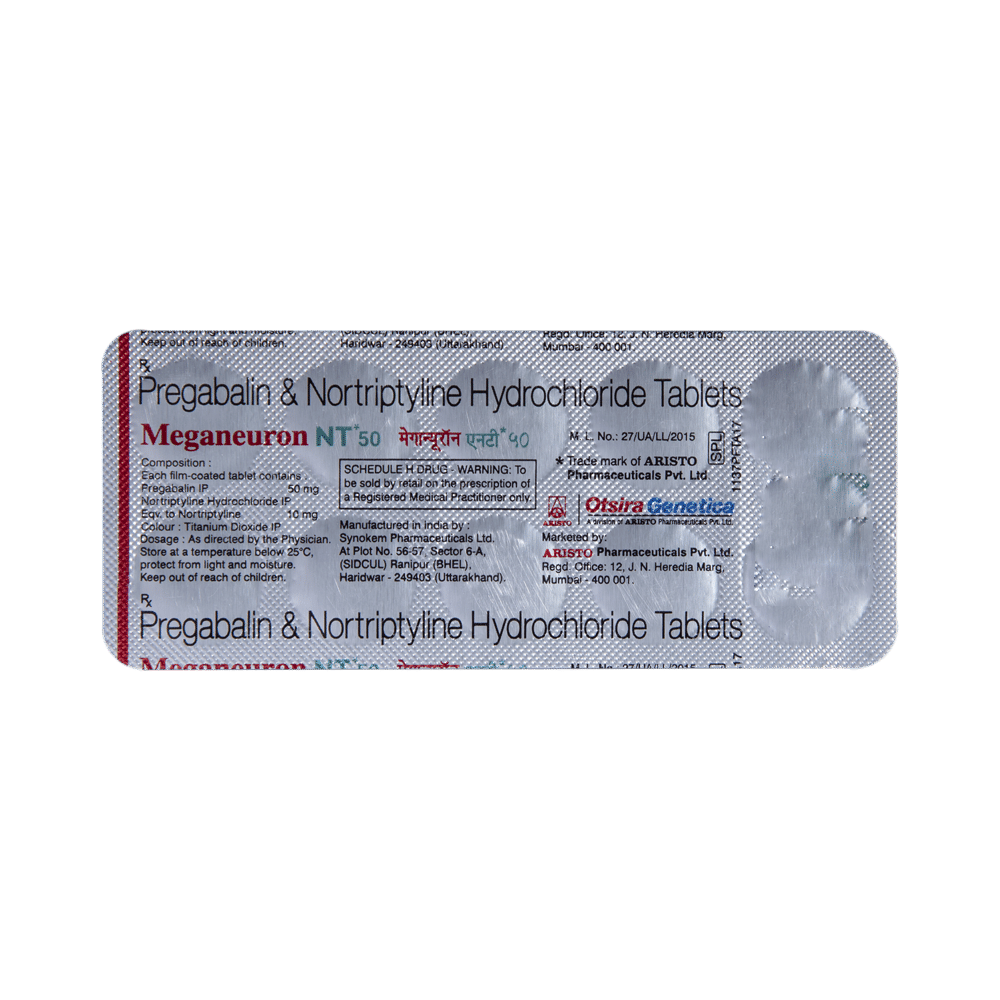 Meganeuron NT 50 Tablet is a combination of two medicines: Pregabalin and Nortriptyline. Pregabalin is an alpha-2 delta ligand that decreases pain by modulating the calcium channel activity of the nerve cells. Nortriptyline is a tricyclic antidepressant that increases the levels of chemical messengers (serotonin and noradrenaline) that stop the movement of pain signals in the brain. Together, they relieve neuropathic pain (pain from damaged nerves).