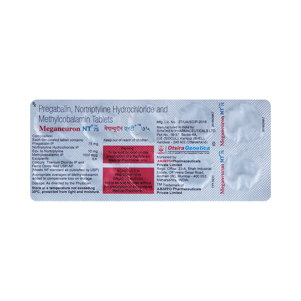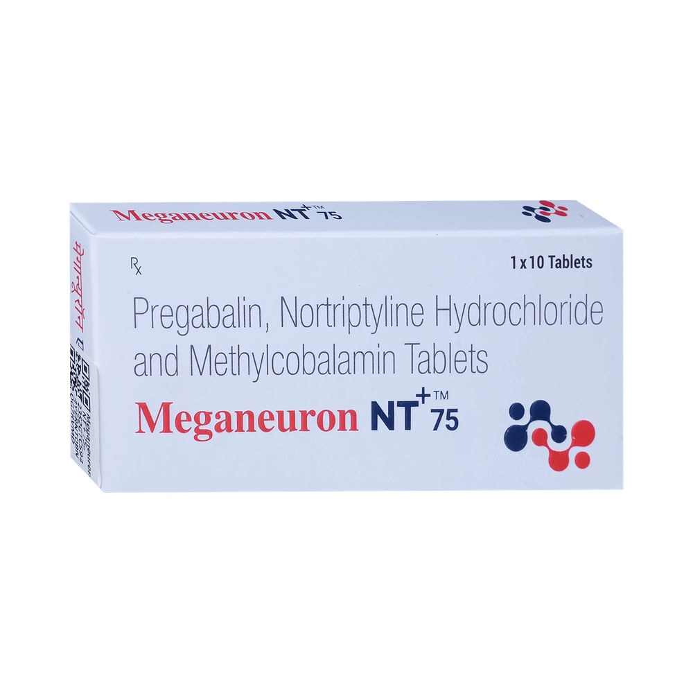Meganeuron NT + 75 Tablet is a combination of three medicines used to treat neuropathic pain. It works by decreasing pain by controlling calcium channel activity of the nerve cells. It also increases the level of chemical messengers in the brain that help in regulating the mood and protect nerve fibers. Meganeuron NT + 75 Tablet can be taken with or without food. However, it is advised to take it at the same time each day as this helps to maintain a consistent level of medicine in the body. Take this medicine in the dose and duration advised by the doctor. If you miss a dose of this medicine, take it as soon as you remember. Finish the full course of the treatment even if you feel better. It is important not to stop taking this medicine suddenly as it may worsen your symptoms.Some common side effects of this medicine include constipation, weight gain, and dryness in mouth. It may cause dizziness and sleepiness, so do not drive or do anything that requires mental focus until you know how this medicine affects you. This medicine may cause weight gain and to control it, you should have a balanced diet and exercise regularly. You must inform your doctor if you develop any unusual changes in mood or behavior, new or worsening depression, or suicidal thoughts.Before taking this medicine let your doctor know if you suffer from kidney or liver disease. Your doctor should also know about all other medicines you are taking as many of these may make this medicine less effective or change the way it works. Inform your doctor if you are pregnant, planning pregnancy or breastfeeding.