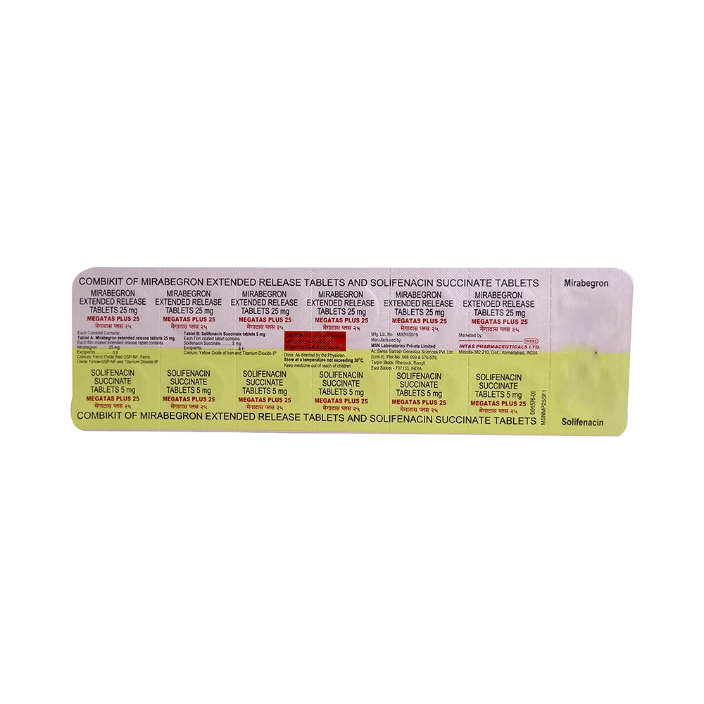 Megatas Plus 25 Combikit is a combination of two medicines used in the treatment of the symptoms of an overactive bladder. It relieves urinary symptoms like frequent urination, urgent need to urinate and inability to control urination. Megatas Plus 25 Combikit is advised to be taken in the dose and duration as prescribed by your doctor. It may be taken with or without food, preferably at the same time each day. You should not stop taking the medicine without consulting the doctor as it may lead to the worsening of your symptoms. The course of the treatment should be completed for better efficacy of the medicine.Some of the common side effects of this medicine are hypertension (high blood pressure), nasopharyngitis (inflammation of the throat and nasal passages), urinary tract infection, and headache. If any of the side effects bother you or persist, consult the doctor without delay.Before receiving the treatment, inform your doctor if you are on any medication for any other health condition. If you are pregnant or breastfeeding, tell your doctor prior to the treatment. People with liver or kidney disease must be cautious while receiving the prescription and they must receive regular follow-ups as per the doctor’s advice.