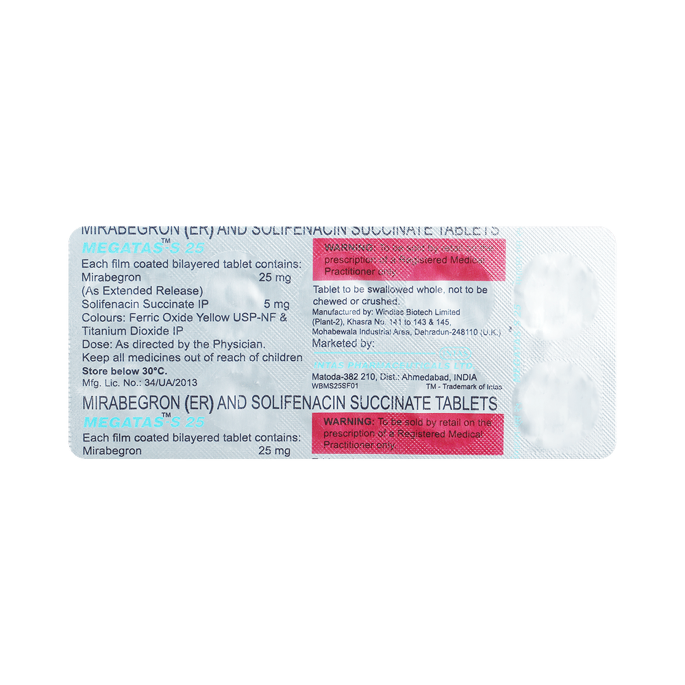 Megatas-S 25 Tablet ER is a combination of two medicines used in the treatment of the symptoms of an overactive bladder. It relieves urinary symptoms like frequent urination, urgent need to urinate and inability to control urination. Megatas-S 25 Tablet ER is advised to be taken in the dose and duration as prescribed by your doctor. It may be taken with or without food, preferably at the same time each day. You should not stop taking the medicine without consulting the doctor as it may lead to the worsening of your symptoms. The course of the treatment should be completed for better efficacy of the medicine.Some of the common side effects of this medicine are hypertension (high blood pressure), nasopharyngitis (inflammation of the throat and nasal passages), urinary tract infection, and headache. If any of the side effects bother you or persist, consult the doctor without delay.Before receiving the treatment, inform your doctor if you are on any medication for any other health condition. If you are pregnant or breastfeeding, tell your doctor prior to the treatment. People with liver or kidney disease must be cautious while receiving the prescription and they must receive regular follow-ups as per the doctor’s advice.