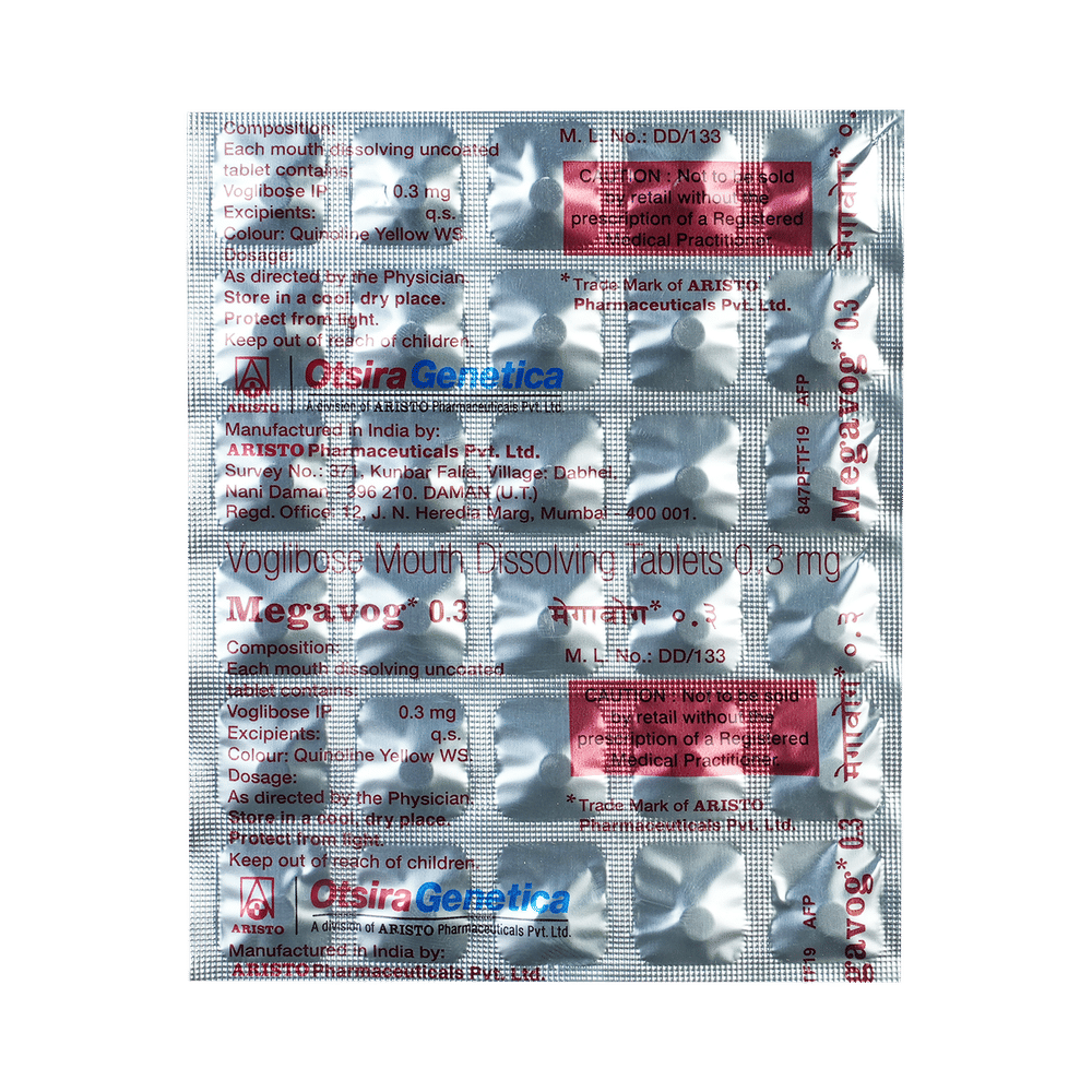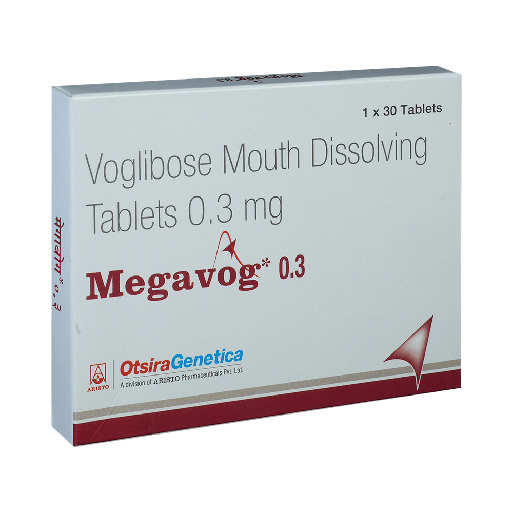 Megavog 0.3 Tablet MD is a medicine used to treat type 2 diabetes mellitus. It helps control the high blood sugar levels in your body after each meal. It is used when other similar medicines along with a restricted diet, are unable to control abnormally high blood sugar levels. Megavog 0.3 Tablet MD should be taken just before a meal. The dose and how often you need it will be decided by your doctor so that you get the right amount to control your blood sugar levels. Do not stop taking it suddenly without consulting your doctor. If you do, your blood sugar levels may increase and put you at risk of serious complications like kidney damage and blindness.This medicine is only part of a treatment program that should also include a healthy diet, regular exercise, and weight reduction as advised by your doctor. Monitor your blood sugar levels regularly while taking this medicine.The most common side effects of Megavog 0.3 Tablet MD include flatulence (gas), stomach pain, loss of appetite, constipation, and diarrhea. Consult your doctor if any of these side effects bother you or do not go away. This medicine by itself does not cause hypoglycemia (low blood sugar levels). However, when used in combination with other diabetes medicines (especially insulin or sulphonylureas), it can lead to hypoglycemia (low blood sugar levels). Such episodes of hypoglycemia will have to be treated by taking plain glucose. Table sugar or common sugar will not help correct low blood sugar levels if you are taking this medicine.Before taking it, let your doctor know if you have any kidney or liver problems. Do not take this medicine if you have ulceration or inflammation in the bowel (eg. ulcerative colitis or Crohn’s disease). Pregnant or breastfeeding women should also consult their doctor before taking it. Please tell your doctor about all the other medicines you are taking to make sure you are safe. Avoid excessive alcohol intake while taking this medicine as it may increase the risk of hypoglycemia (low blood sugar levels).