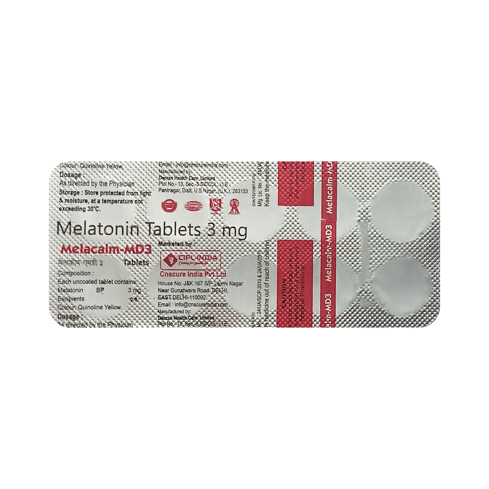 Melacalm-MD3 Tablet is a medicine used in the treatment of insomnia and jet lag (a sleep disorder due to frequent travel to different time zones). It reduces jet lag symptoms such as irritability, indigestion, daytime tiredness, and sleep disturbances. Melacalm-MD3 Tablet helps to synchronize the body’s biological day-night rhythm. It should be taken either 2 hours before or 2 hours after food, preferably at bedtime. However, it is advised to take it at a fixed time each day to maintain a consistent level of medicine in the blood. You should never skip any doses and finish the full course of treatment even if you feel better. This medicine should not be stopped suddenly without talking to your doctor.Some common side effects of this medicine include headache and drowsiness. It even causes dizziness and sleepiness, so do not drive or do anything that requires mental focus until you know how this medicine affects you. It is important to note that this medicine should not be used for daily naps.Consult your doctor before taking this medicine if you are suffering from any liver or kidney problems. You should avoid smoking and alcohol while using this medicine. Pregnant and breastfeeding mothers should not use this medicine. However, if the need arises, please consult your doctor before using it.