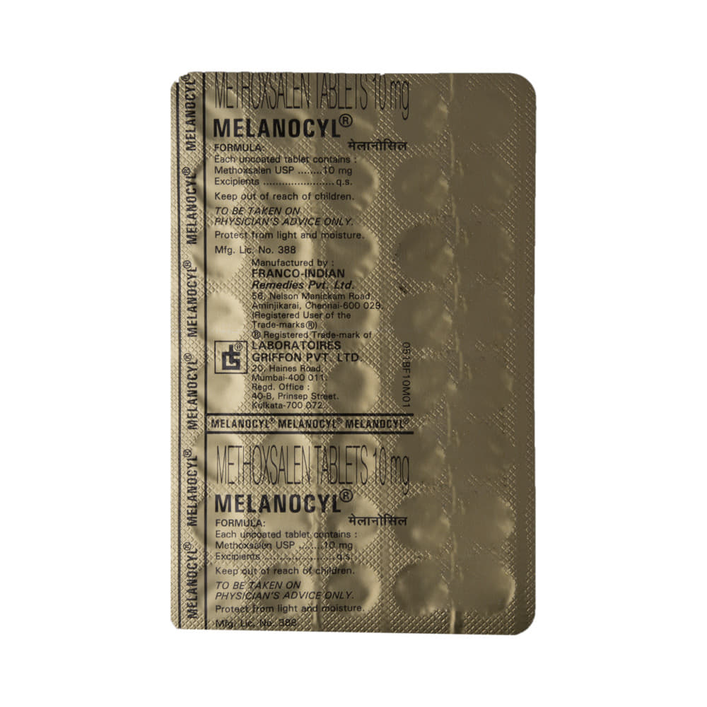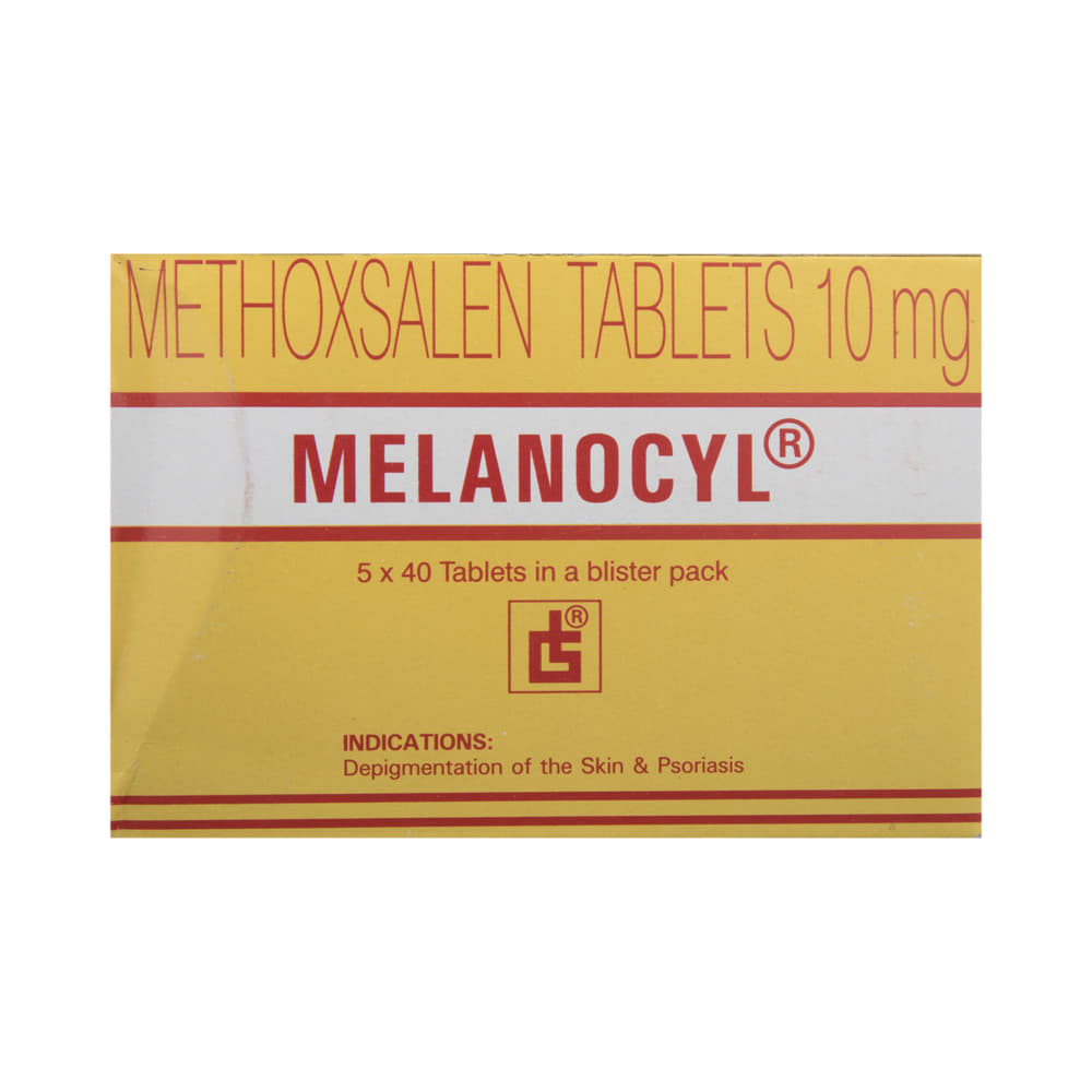 MeLAnocyl Tablet is a medicine used along with controlled ultraviolet light for effective treatment of certain skin diseases like vitiligo and psoriasis. MeLAnocyl Tablet is taken after meals in a dose and duration as advised by the doctor. Taking with food helps to increase the absorption of the medication as well as decrease nausea. The dose you are given will depend on your condition and how you respond to the medicine. You should keep taking this medicine for as long as your doctor recommends. If you stop treatment too early your symptoms may come back and your condition may worsen. Let your doctor know about all other medications you are taking as some may affect, or be affected by this medicine.The most common side effects of MeLAnocyl Tablet are nausea, itching, and redness of the skin. Most of these are temporary and usually resolve with time. Contact your doctor straight away if you are at all concerned about any of these side effects. It may also cause dizziness and sleepiness, so do not drive or do anything that requires mental focus until you know how this medicine affects you. Avoid drinking alcohol while taking this medicine as it can make dizziness worse.Taking this medicine makes the skin more sensitive to the sun. Use sunscreen and wear protective clothing when outdoors. Try to avoid exposure of your skin and lips to sunlight for eight hours after treatment.