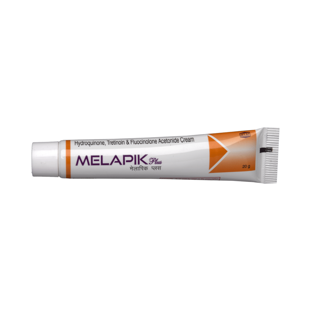 Melapik Plus Cream is a prescription medicine having a combination of medicines that is used to treat melasma. It helps in quick skin renewal. It provides relief from redness, swelling and itching. Melapik Plus Cream should be used in the dose and duration as advised by your doctor. Wash your hands before using this medicine. It is advised to check the label for directions before use. It is for external use only.Do not use this medicine more than the recommended dose. Inform your doctor if you have known allergies from this medicine. The common side effects of this medicine include burning, irritation, itching and redness at the application site, acne, and dry mouth.If these side effects or any other symptoms which you think are because of this medicine persist for a longer duration, please consult your doctor. Inform your doctor if you are pregnant or are suffering from any other disease. This medicine is not safe to use in breastfeeding mothers.