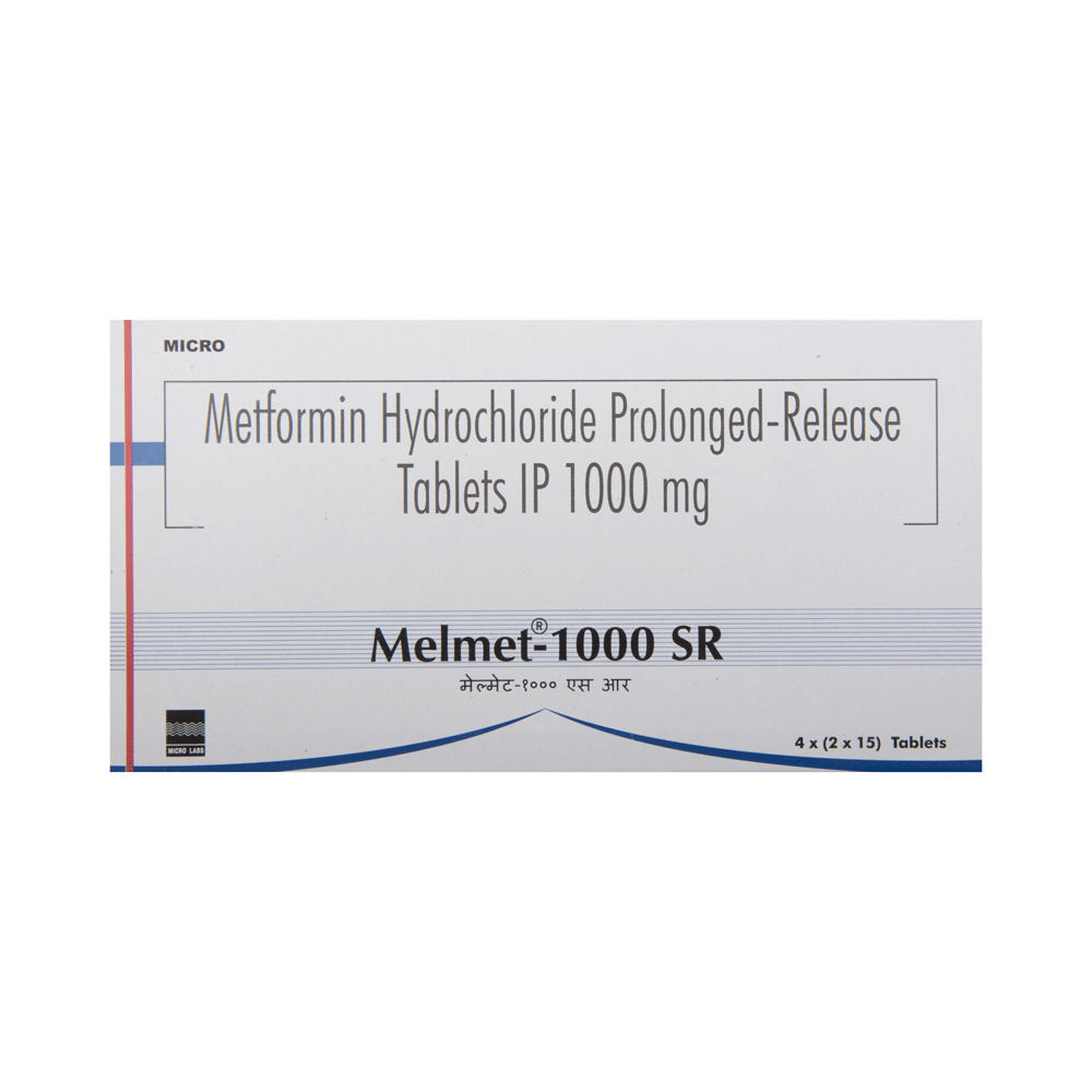 Melmet 1000 SR Tablet is a medicine used to treat type 2 diabetes mellitus. It helps control blood sugar levels and thus prevents serious complications of diabetes. It is also used to treat a menstruation-related disorder known as polycystic ovary syndrome (PCOS) in women. Melmet 1000 SR Tablet is best taken with food to avoid nausea and abdominal pain. You should take it regularly, at the same time each day, to get the most benefit. You should not stop taking this medicine unless your doctor recommends it. Your lifestyle plays a big part in controlling diabetes. Therefore, it is important to stay on the diet and exercise program recommended by your doctor while taking this medicine.The most common side effects of this medicine include diarrhea, nausea, vomiting, abdominal discomfort, headache, and loss of appetite. Some people may develop hypoglycemia (low blood sugar level) when this medicine is taken along with other antidiabetic medicines or alcohol or upon skipping a meal. Monitor your blood sugar levels regularly while taking it.Before taking this medicine, inform your doctor if you have any kidney, liver, or heart problems. Pregnant or breastfeeding women should also consult their doctor before taking it. Your doctor will check your kidney function before starting treatment with it. Avoid excessive alcohol intake while taking it, as this may increase the risk of developing some side effects.