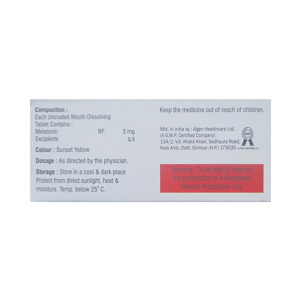Melogram 3 Tablet MD is a medicine used in the treatment of insomnia and jet lag (a sleep disorder due to frequent travel to different time zones). It reduces jet lag symptoms such as irritability, indigestion, daytime tiredness, and sleep disturbances. Melogram 3 Tablet MD helps to synchronize the body’s biological day-night rhythm. It should be taken either 2 hours before or 2 hours after food, preferably at bedtime. However, it is advised to take it at a fixed time each day to maintain a consistent level of medicine in the blood. You should never skip any doses and finish the full course of treatment even if you feel better. This medicine should not be stopped suddenly without talking to your doctor.Some common side effects of this medicine include headache and drowsiness. It even causes dizziness and sleepiness, so do not drive or do anything that requires mental focus until you know how this medicine affects you. It is important to note that this medicine should not be used for daily naps.Consult your doctor before taking this medicine if you are suffering from any liver or kidney problems. You should avoid smoking and alcohol while using this medicine. Pregnant and breastfeeding mothers should not use this medicine. However, if the need arises, please consult your doctor before using it.