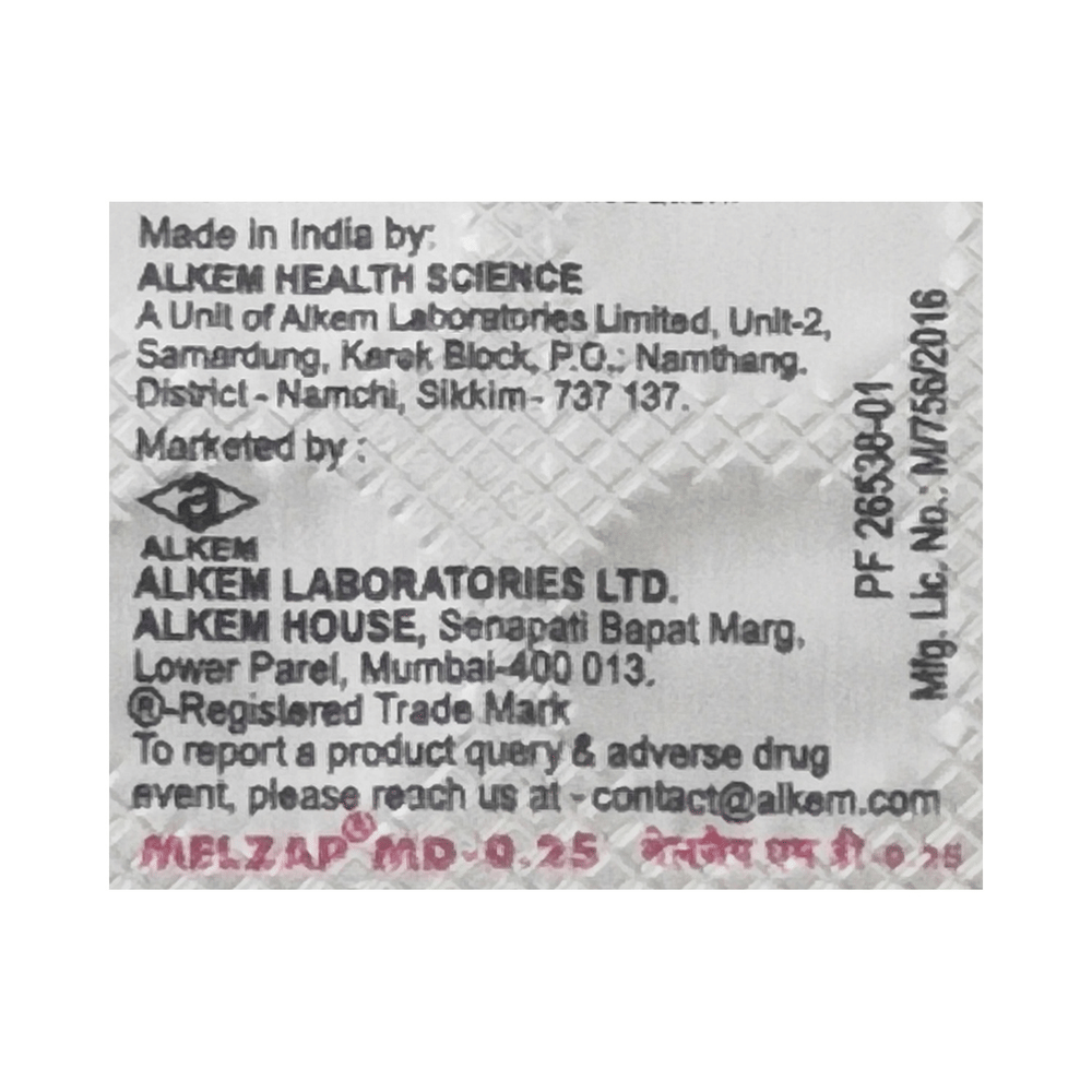If you miss a dose of Melzap MD 0.25 Tablet, take it as soon as possible. However, if it is almost time for your next dose, skip the missed dose and go back to your regular schedule. Do not double the dose.