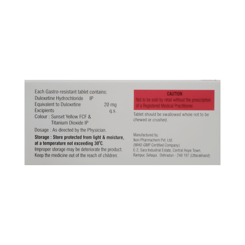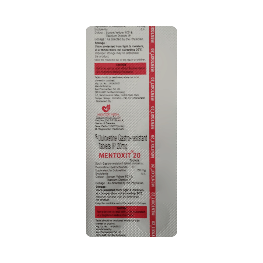 Mentoxit 20 Tablet is used in the treatment of depression, anxiety disorder, diabetic nerve pain, fibromyalgia (a condition in which there are generalized pain and tenderness in the body), neuropathic pain, and stress urinary incontinence. Mentoxit 20 Tablet works by increasing the level of chemical messengers (serotonin and noradrenaline) in the brain that have a calming effect on the brain and relax the nerves, thus treating your illness. It may be taken with or without food. It is advised to take this medicine at a fixed time each day to maintain a consistent level in the blood. If you miss any doses, take it as soon as you remember. Do not skip any doses and finish the full course of treatment even if you feel better. This medication mustn't be stopped suddenly as it may worsen your symptoms.Some common side effects of this medicine include nausea, headache, decreased libido, abnormal dreams, blurred vision, and dry mouth. It even causes dizziness and sleepiness, so do not drive or do anything that requires mental focus until you know how this medicine affects you. However, these side effects are temporary and usually resolve on their own in some time. Please consult your doctor if these do not subside or bother you.Before taking Mentoxit 20 Tablet, inform your doctor if you have any problems with your kidneys, heart, liver, or have a history of seizures (epilepsy or fits). Inform your doctor if you develop any unusual changes in mood or behavior, new or worsening depression, or if you have any suicidal thoughts.