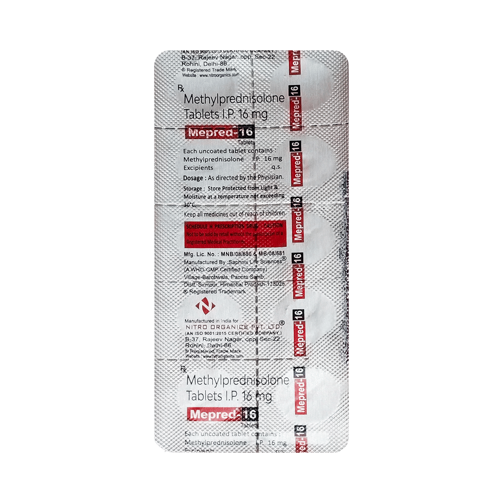 In Treatment of Allergic conditionsMepred 16 Tablet is used to treat different inflammatory and allergic conditions including arthritis, lupus, psoriasis, ulcerative colitis which affect the skin, blood, eyes, lungs, stomach, and nervous system. It works by lowering your immune system’s response to these conditions thereby reducing symptoms such as swelling, pain, itching and other allergic-type reactions.This medicine is given orally (by mouth). You should always take it as it has been prescribed for you. Do not stop taking it without your doctor’s advice. This can cause unpleasant withdrawal symptoms. Because this medicine weakens your immune system, you should avoid being near people who are ill or have infections.In Treatment of Systemic lupus erythematosus (SLE)Systemic lupus erythematosus (SLE) is an autoimmune disease. In this disease, the immune system of the body mistakenly attacks healthy tissue. It can affect the skin, joints, kidneys, brain, and other organs. Mepred 16 Tablet prevents the release of substances in the body that cause inflammation. It lowers your immune system’s response and reduces symptoms such as swelling, pain, itching and other allergic-type reactions.In Treatment of Skin disordersMepred 16 Tablet prevents the release of substances in the body that cause inflammation. It can be used to treat different inflammatory and allergic conditions of the skin such as eczema and psoriasis. It works by lowering your immune system’s response to these conditions thereby relieving symptoms such as swelling, pain, itching and other allergic-type reactions.In Treatment of Eye disordersMepred 16 Tablet helps relieve symptoms of eye infections such as redness, swelling, itching and watering of eyes. This medicine works by decreasing the production of certain chemicals that cause inflammation of the eyes. This will make it easier for you to go about your daily activities. Use it as prescribed to get the most benefit. If you see no improvement even after a week, talk to your doctor.In Treatment of Rheumatic disorderRheumatic disorder is an autoimmune condition where your body’s immune system (which usually fights bacteria and viruses) attacks your body’s own cells. Mepred 16 Tablet stops that from happening and can relieve the symptoms of this condition such as pain, swelling, and stiffness in your joints. It can also slow down joint damage, reduce disability, and enable you to be as active for as long as possible. It can take several weeks or months to notice the effect of the medicine. You should continue taking it until your doctor says it is okay to stop using the medicine.show moreshow less