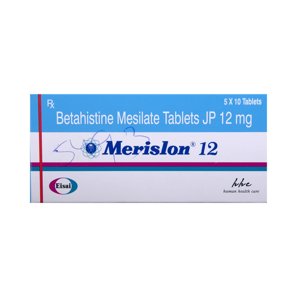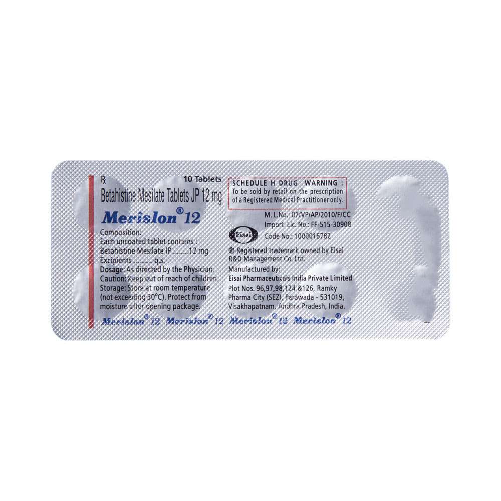 Merislon 12 Tablet is used to prevent and treat a disorder of the inner ear known as Ménière’s disease. The symptoms include dizziness (vertigo), ringing in the ears (tinnitus), and loss of hearing, probably caused by fluid in the ear. This medicine helps relieve the symptoms by reducing the amount of fluid. Merislon 12 Tablet should be swallowed whole with water and taken at the same time(s) each day to get the most benefit. Your doctor will decide what is the correct dose to relieve your symptoms and how often you need to take it. You may need to take this medicine for several months and you should take it for as long as prescribed by your doctor, even if you start feeling better. The most common side effects include headache, feeling sick, and indigestion (dyspepsia). You may also get stomach pain and bloating. Taking the medicine with food can help reduce stomach problems.  Before taking this medicine, you should talk to your doctor if you have a stomach ulcer, asthma, or high or low blood pressure. You must also tell him/her what other medicines you are taking, to make sure you are safe. Also speak to your doctor if you are pregnant, trying to become pregnant, or breastfeeding.