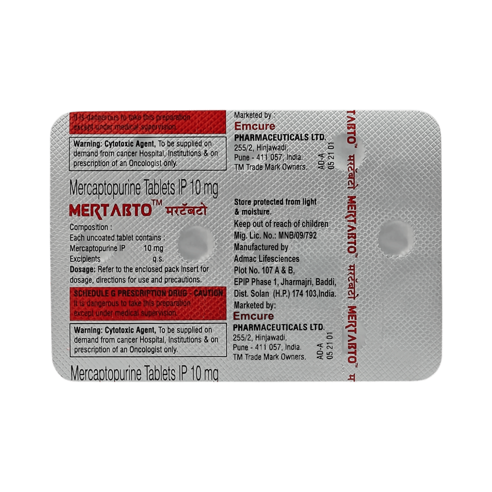 In Treatment of Blood cancerBlood cancer, also called leukemia, is a cancer of the blood-forming tissues that decreases the body's ability to fight infection. Mertabto 10mg Tablet kills or stops the growth of cancer cells and prevents the multiplication of cancer cells. It is an effective medicine, but you should discuss the side effects and benefits of this medicine with your doctor. Let your doctor know if any of the side effects bother you.
