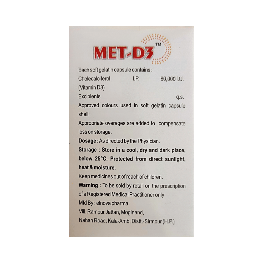 Met-D3 Softgel Capsule is a form of vitamin D. It raises vitamin D levels in your blood. This, in turn, increases calcium levels in your blood by helping you absorb more calcium from food.