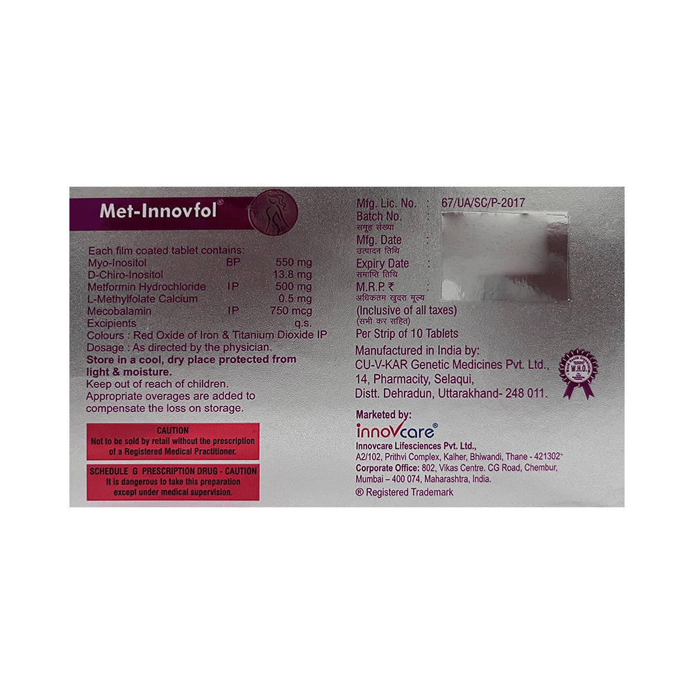 Met-Innovfol Tablet is a combination of medicines used in the treatment of polycystic ovarian syndrome (PCOS). It regulates ovulation and menstrual cycles (periods) in PCOS. It enhances the body's response to insulin, and maintains hormonal balance. This improves your overall health. Met-Innovfol Tablet should be taken in the dose and duration as advised by your doctor. It is to be taken with food, preferably at the same time each day. If you miss a dose, take it as soon as possible. However, if it is almost time for your next dose, skip the missed dose and go back to your regular schedule. Do not double the dose.It may cause side effects like taste change, nausea, vomiting, diarrhea, stomach pain, loss of appetite, and hypoglycemia (low blood sugar). However, these are temporary and usually subside on their own. Please consult your doctor in case these do not resolve or persist for a longer duration.Before taking this medicine, inform your doctor if you have any kidney, liver or heart problems. Pregnant or breastfeeding women should also consult their doctor before taking it. Your doctor will check your kidney function tests before starting treatment with it. Avoid excessive alcohol intake while taking it as this may increase the risk of developing some side effects.