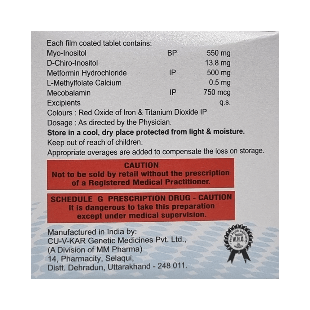 Salt Composition: Myo-Inositol (550mg) + D-Chiro Inositol (13.8mg) + Metformin (500mg) + L-Methyl Folate Calcium (0.5mg) + Methylcobalamin (750mcg)
