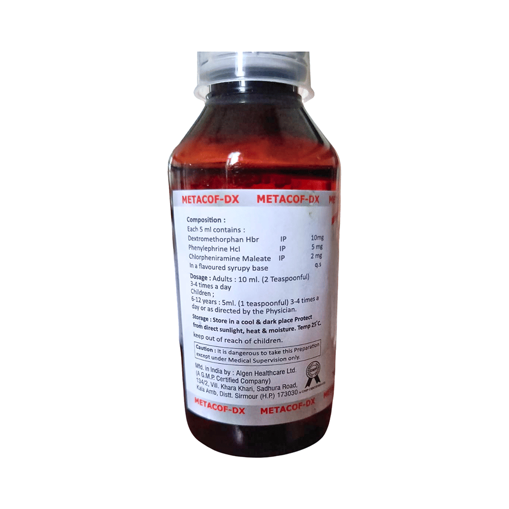 Metacof-DX Syrup is a medicine used in the treatment of common cold and cough. It can provide quick relief from cough and common cold symptoms like runny nose, stuffy nose, sneezing, watery eyes, and congestion or stuffiness. Metacof-DX Syrup is taken with or without food in a dose and duration as advised by the doctor. The dose you are given will depend on your condition and how you respond to the medicine. You should keep taking this medicine for as long as your doctor recommends. If you stop treatment too early your symptoms may come back and your condition may worsen. Let your healthcare team know about all other medications you are taking as some may affect, or be affected by this medicine.Common side effects of this medicine include headache, sedation, double vision, vomiting, diarrhea, dry mouth, and nausea. Most of these are temporary and usually resolve with time. Contact your doctor straight away if you are at all concerned about any of these side effects. This medicine can also cause sleepiness, so do not drive or do anything that requires mental focus until you know how this medicine affects you. Avoid drinking alcohol while taking this medicine as it can worsen your sleepiness.Never support self-medication or recommend your medicine to another person. It is beneficial to have plenty of fluids while taking this medication. Before taking this medicine, you should tell your doctor if you are pregnant, planning pregnancy or breastfeeding. You should also tell your doctor if you have any kidney or liver diseases so that your doctor can prescribe a suitable dose for you.
