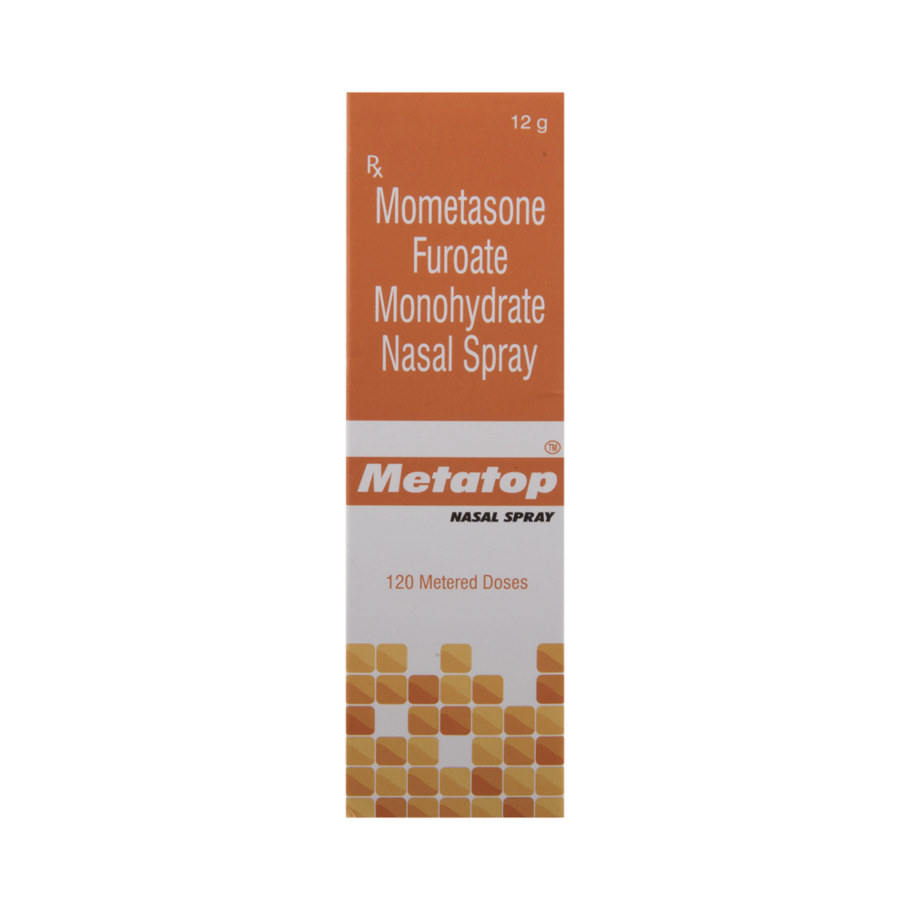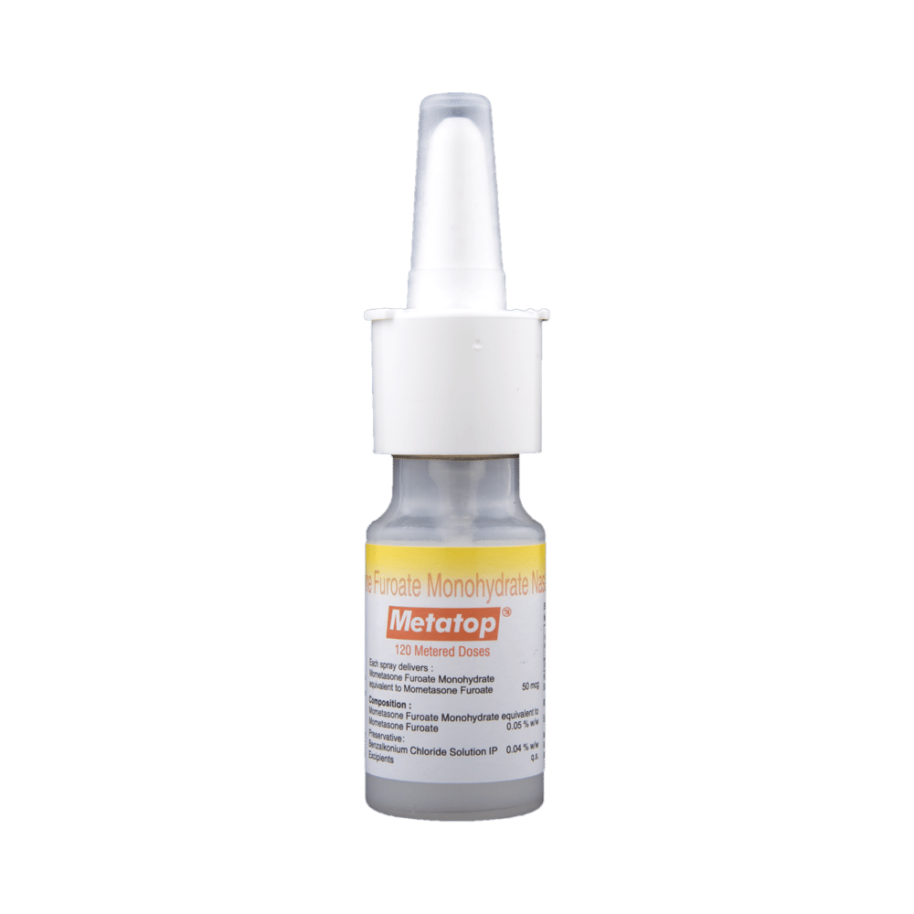 MEtatop Nasal Spray is a medicine used to prevent and treat allergic symptoms like sneezing and runny nose due to allergies, nasal congestion, and nasal polyps. It works by reducing swelling and irritation in your nose and belongs to a group of medicines called corticosteroids. You should always use MEtatop Nasal Spray as advised by your doctor. To get the full benefit of the medicine you should take it regularly. Blow your nose gently before using it, keep one nostril closed while applying the medicine into the other, and then sniff hard to make sure it reaches deep into the nose. Repeat for the other nostril.The most common side effects of this medicine include nasal irritation, sore throat, wheezing, nosebleed, upper respiratory tract infection, viral infections, and vomiting. If you are worried about any of the side effects, let your doctor know. Your doctor might be able to help you cope with the side effects. In general, you should try to avoid situations which make your symptoms worse (things like pollen and dust mites) and it’s best not to smoke.Before using this medicine, you should ask your doctor for advice if you are pregnant or breastfeeding. It is important to discuss the risks and benefits with your doctor. Let your doctor also know if you have any other medical conditions taking any other medicines.