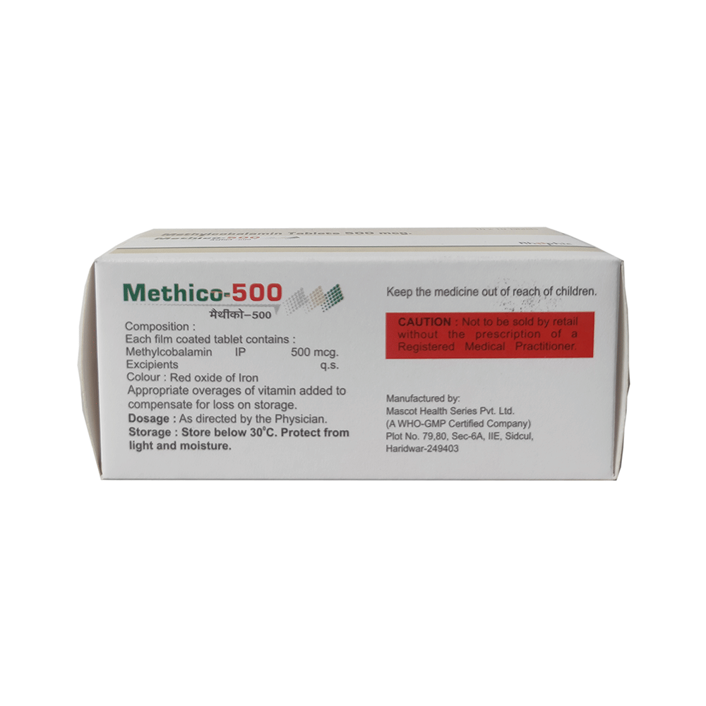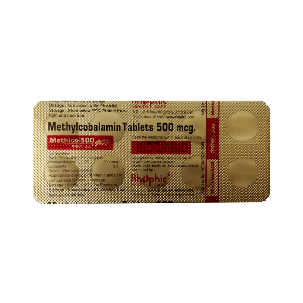 Methico 500 Tablet is a supplement of vitamin B12. Vitamin B12 is important for the brain and nerves, and for the production of red blood cells. This medicine is used to treat vitamin B12 deficiency. It is also sometimes used in people with pernicious anemia and other conditions. Methico 500 Tablet should be taken in dosage and duration as advised by the doctor. The dosage should not be exceeded without the consultation of a doctor. Inform your doctor if you are taking any other medicines.Common side effects of this medicine include nausea, vomiting, diarrhea, loss of appetite, and headache. If any of this bothers you, you should let your doctor know. before taking this medicine, let your doctor if you have any preexisting medical condition. Let your doctor also know about all the medicines you are taking.